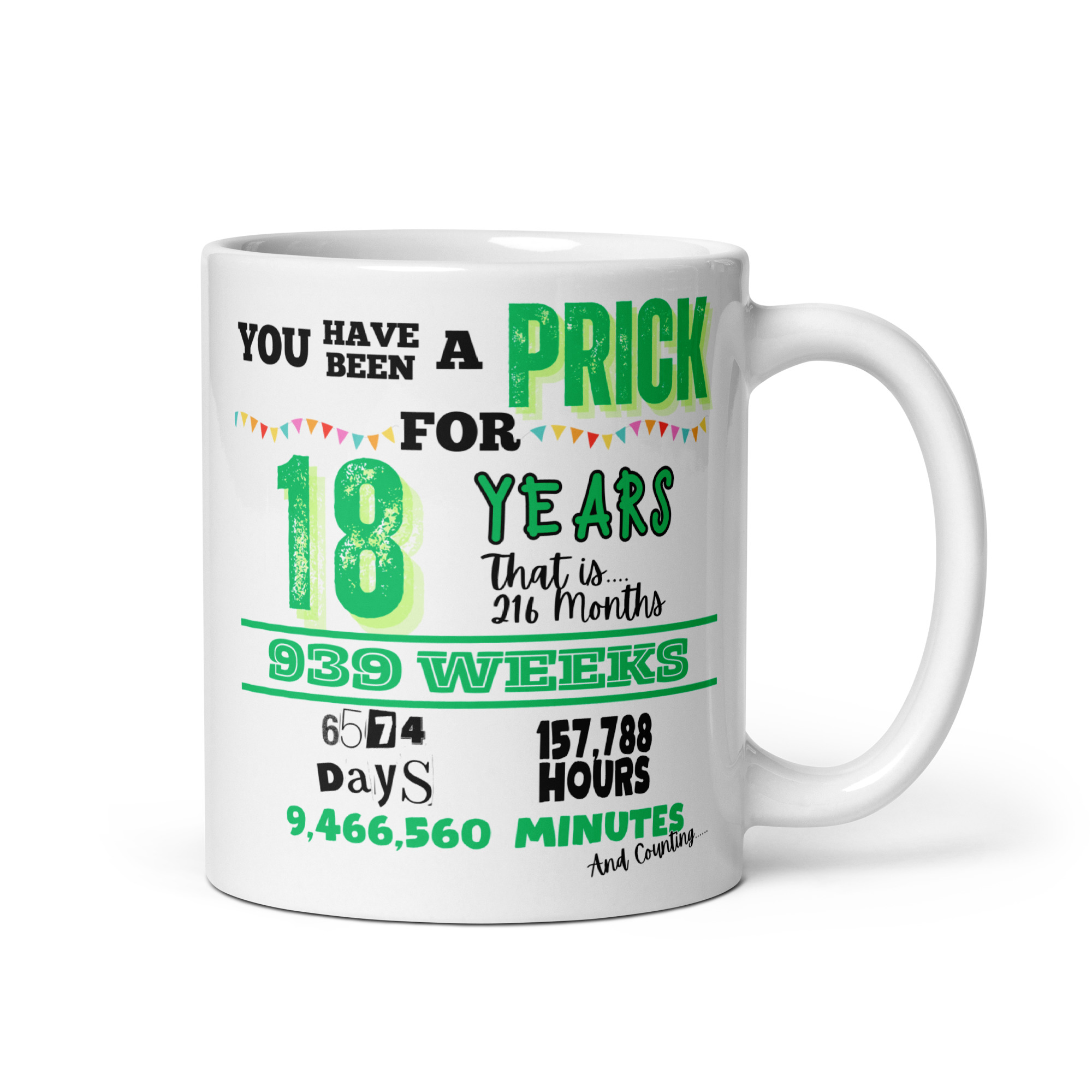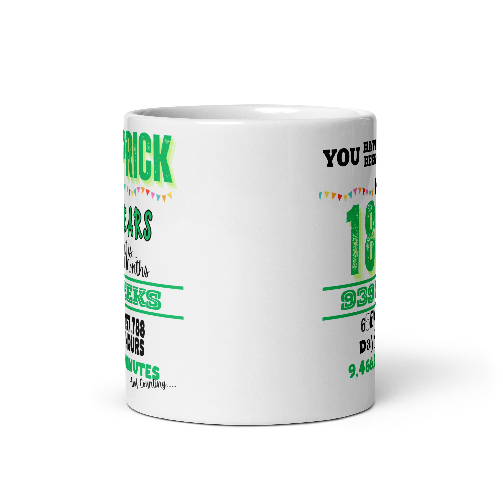 What makes this 18th birthday mug work so well is the way it balances the milestone with the insult. The oversized “18” keeps the age front and centre, so it feels made for the occasion, while the rest of the text piles on the joke in exactly the right way. Calling someone a prick on their 18th only really works if you know they will take it as intended, and for the right sort of person it is far funnier than anything polite.