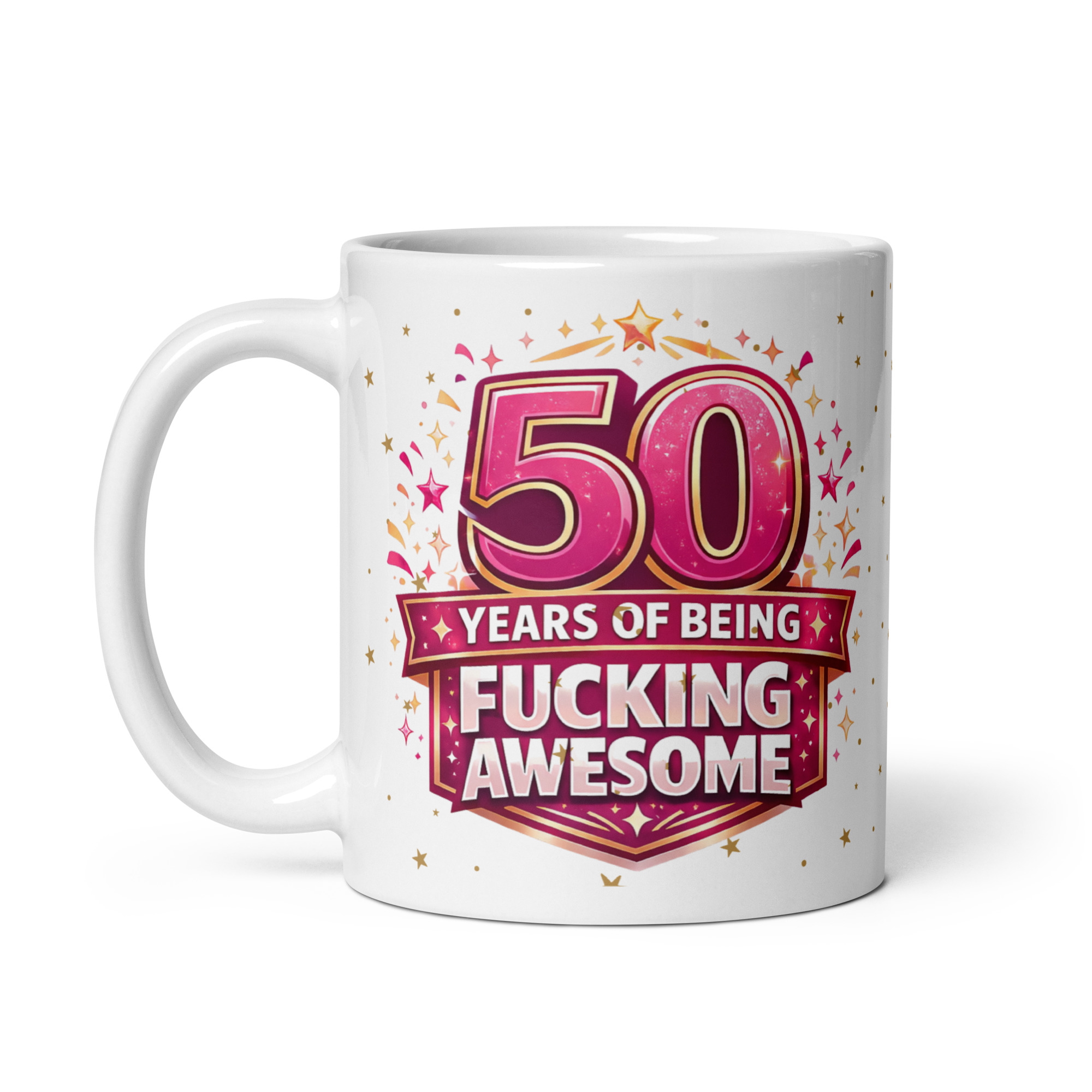 A novelty mug is always better when it actually looks decent, and this one absolutely does. The bright pink design pops beautifully against the white ceramic, while the gold accents and scattered stars add just enough sparkle to make it feel occasion-worthy. The badge-style layout has a slightly trophy-like feel, which works perfectly with the message. After all, fifty years of being fucking awesome probably does deserve some sort of official recognition.