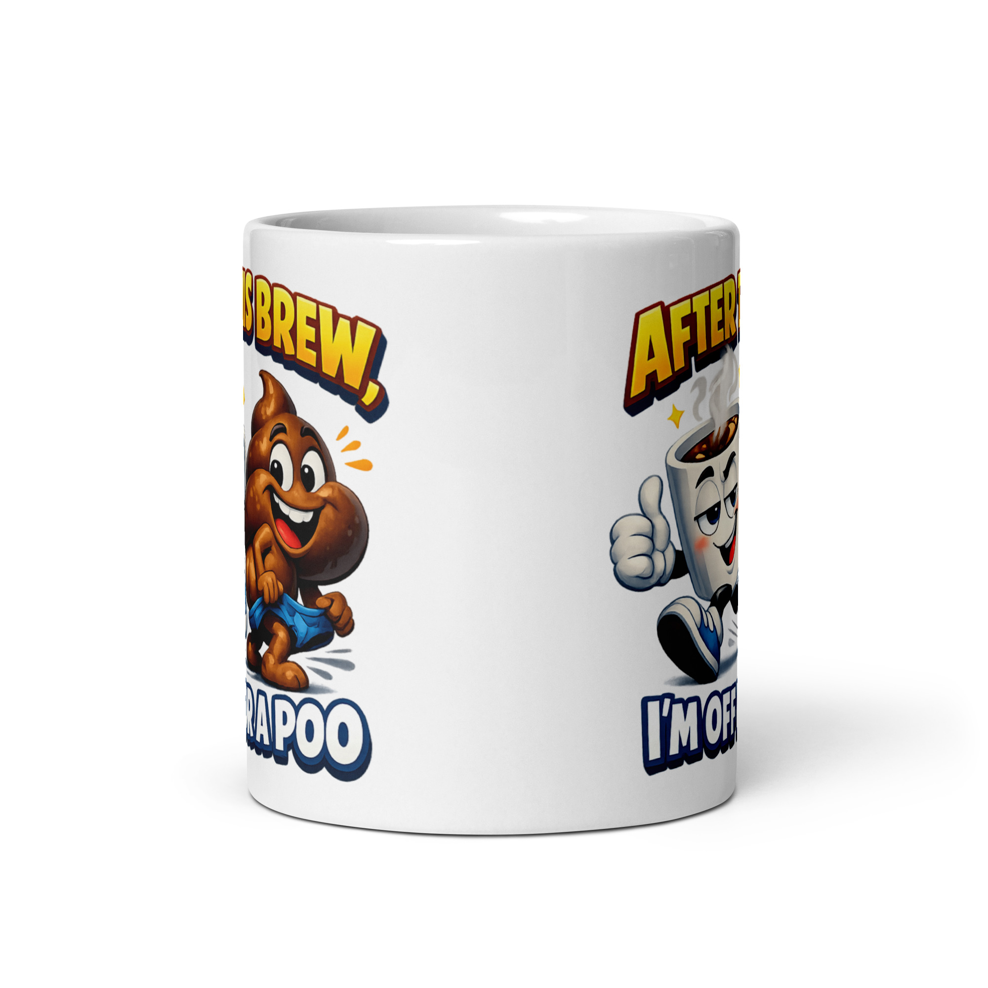 The design is bright, silly, and full of character. Across the top, the bold yellow and orange text of “After This Brew” sets the scene, while the bottom line lands the punchline with full confidence. Between them are two cartoon stars of the show: a smug little coffee mug giving a thumbs up and a grinning poo character in blue pants looking far too pleased with itself. It is ridiculous, obviously, but that is what makes it work. The playful faces, the movement in the artwork, and the crisp comic-style layout all give the mug a lively, upbeat feel rather than making it look like a lazy joke slapped on ceramic.