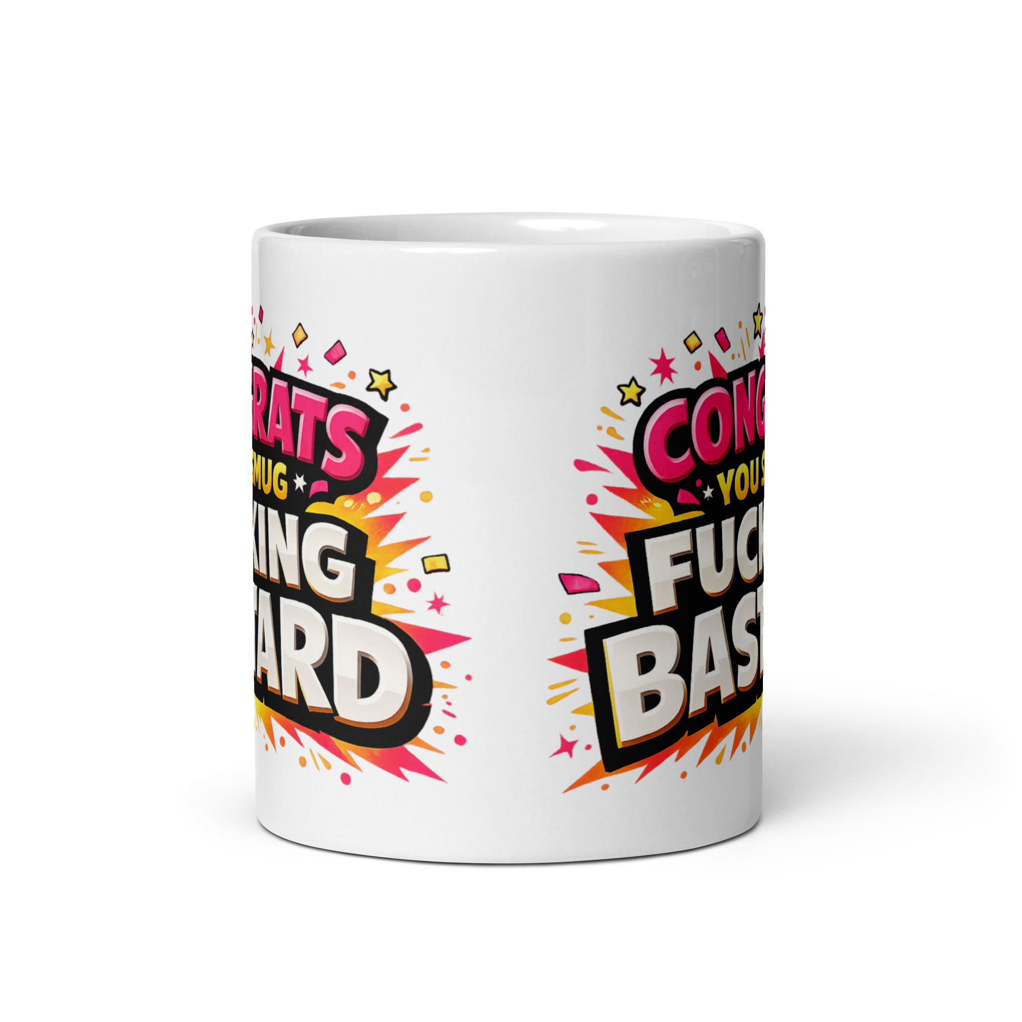 The design is loud in all the right ways. Big chunky lettering, bright pink, yellow, orange and white text, and a full-on burst of confetti and star graphics give it that over-the-top celebration feel, only with a very different tone from your average “well done” gift. The phrase lands like a proper punchline, with “FUCKING BASTARD” front and centre in huge bold type that makes sure nobody misses the joke. On a crisp white ceramic mug, the colours really stand out, giving the whole thing a fun, cheeky, comic-book style that feels made for people with a wicked sense of humour.