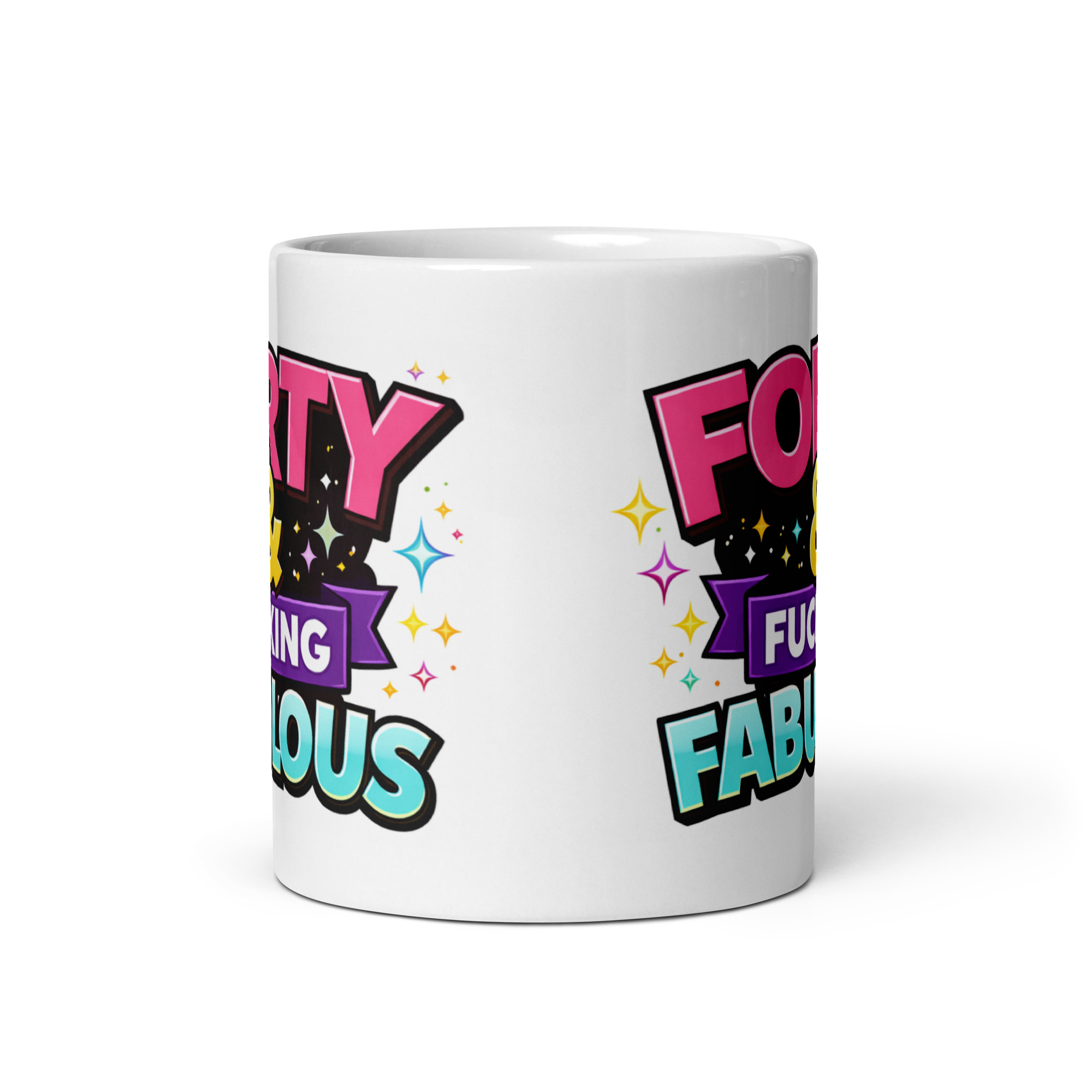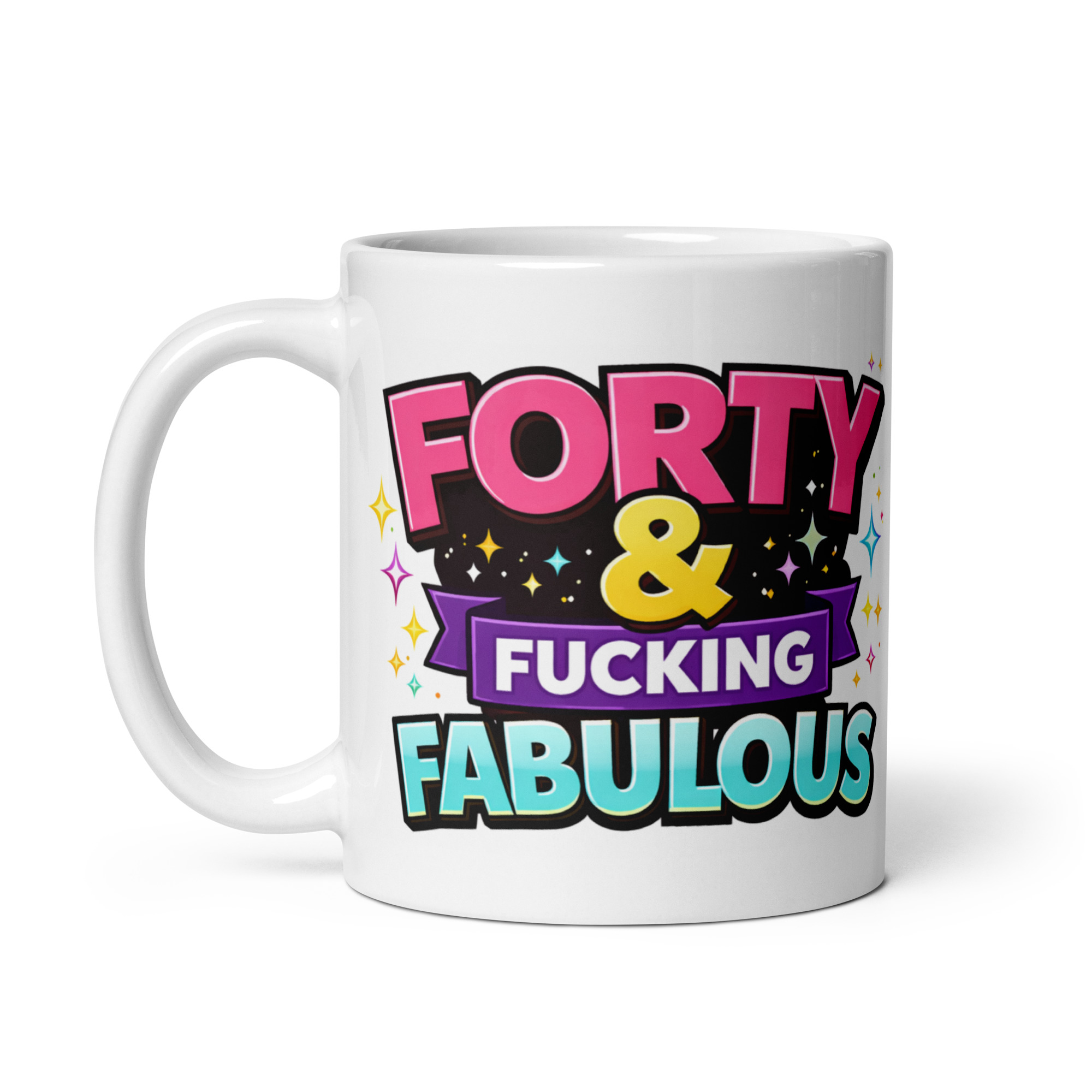 Visually, this mug does exactly what you want it to do. The bright pink “Forty” grabs attention straight away, while the purple banner and aqua-blue “Fabulous” give the whole design a layered, colourful look that really pops. The gold-toned ampersand in the middle ties it all together nicely, and the little starburst sparkles scattered around the text give it just enough party energy to make it feel special. It is bright, lively and easy to read, which matters when the slogan is meant to be the star of the show.