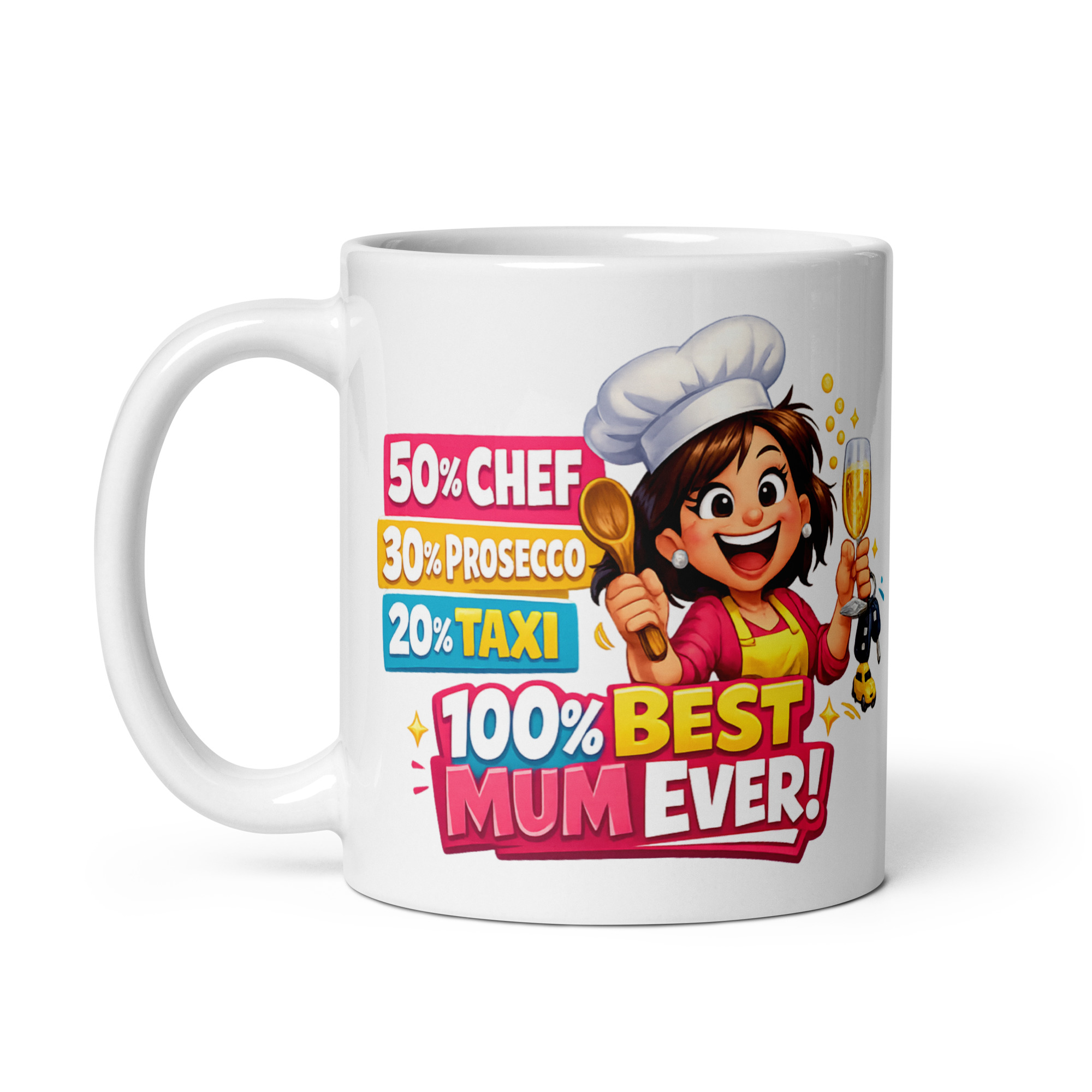 The wording does all the heavy lifting in the best way: “50% Chef, 30% Prosecco, 20% Taxi, 100% Best Mum Ever!” It is playful, affectionate and spot on for the sort of mum who spends half her life feeding people, driving people about and somehow still finding the patience to put up with everyone. The design has a fun, lively look that makes it ideal for Mother’s Day, birthdays or just as a little thank you gift for the woman who has done far more than she probably signed up for.
