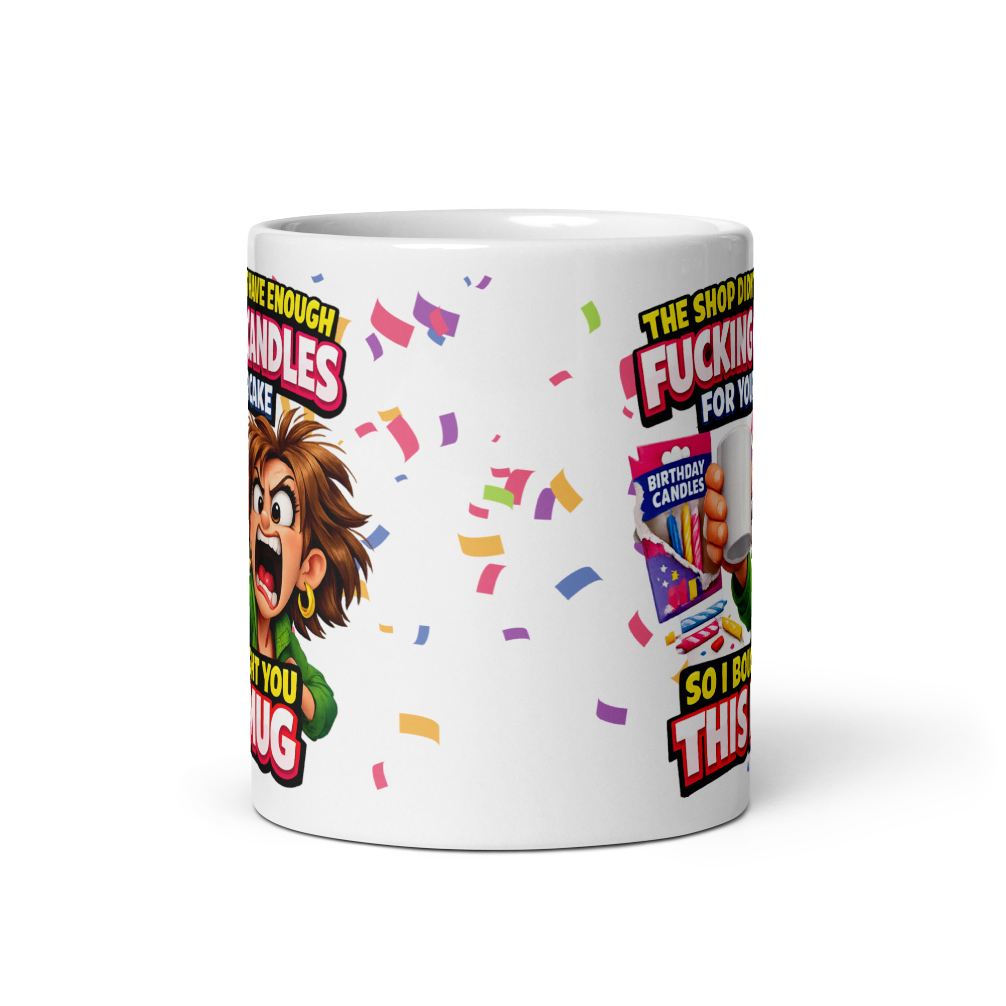 The design has plenty of energy too. The bold, oversized lettering gives the message proper impact, with bright pink, yellow, blue and white colours jumping out against the white ceramic. There is confetti scattered around the print to keep it feeling celebratory, while the furious cartoon character clutching a mug and surrounded by birthday candles adds even more personality. She looks like she has fully committed to the joke and cannot be bothered pretending otherwise, which suits the wording perfectly. Altogether, it feels chaotic, funny and very much like the sort of birthday mug that gets unwrapped and read out loud for maximum effect.