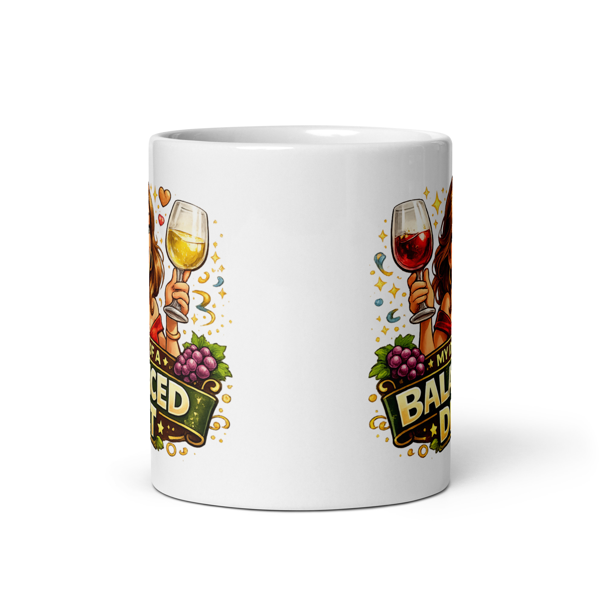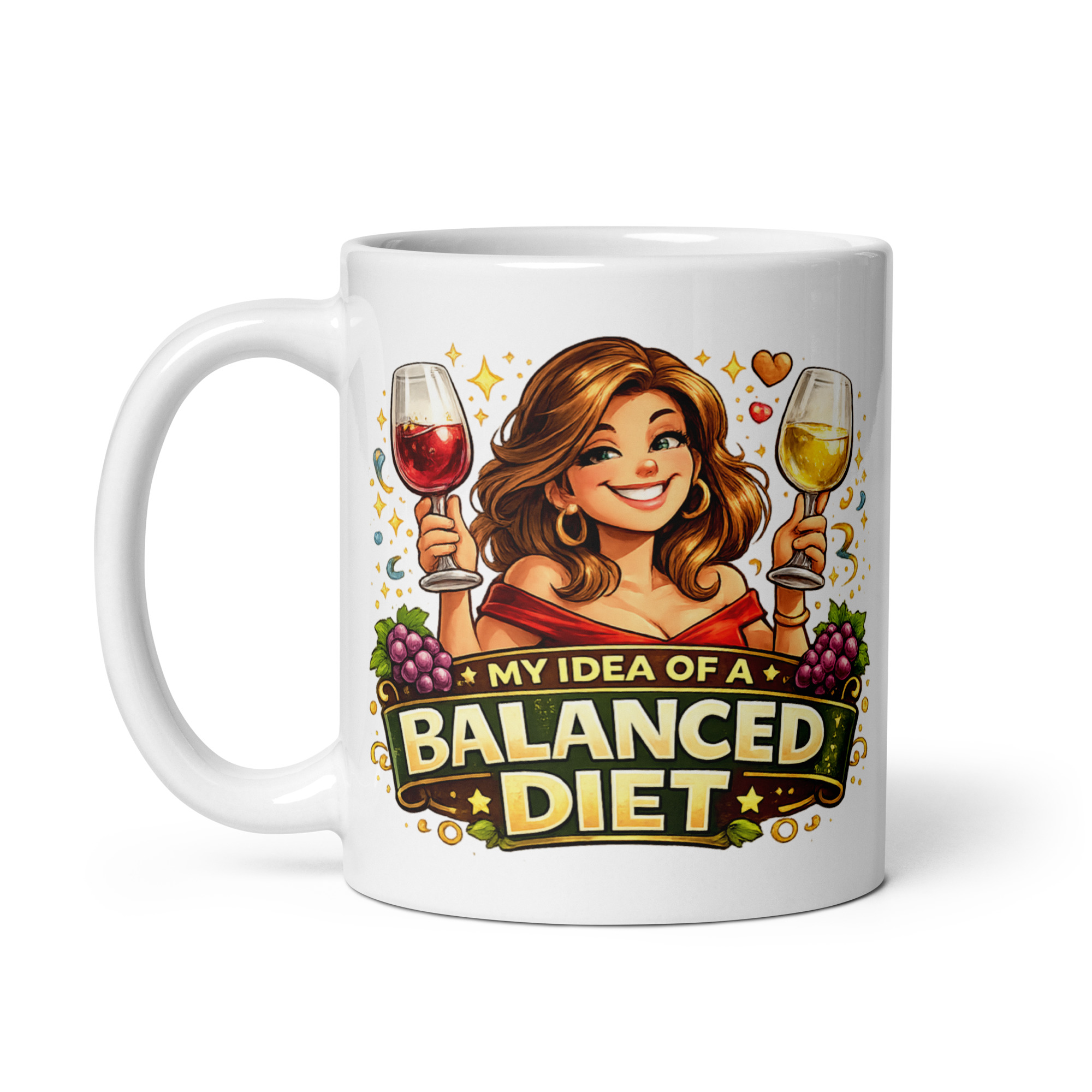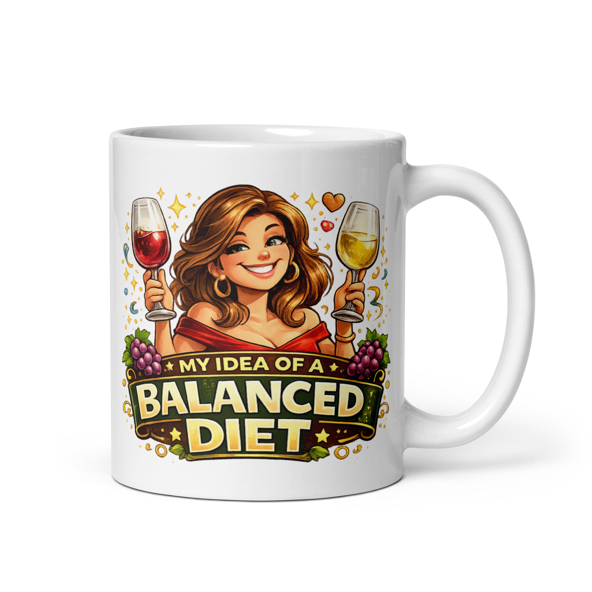 The artwork really helps sell the joke too. Front and centre is a smiling, confident woman raising two glasses of wine like she has absolutely no intention of pretending water is more exciting. One glass is red, the other white, which is where the “balanced diet” line gets its charm. Around her you have sparkling details, grapes and warm golden accents that give the whole mug a lively, indulgent feel. It looks playful and polished at the same time, which is exactly what you want from a gift mug aimed at women who enjoy a laugh and a decent glass of wine.