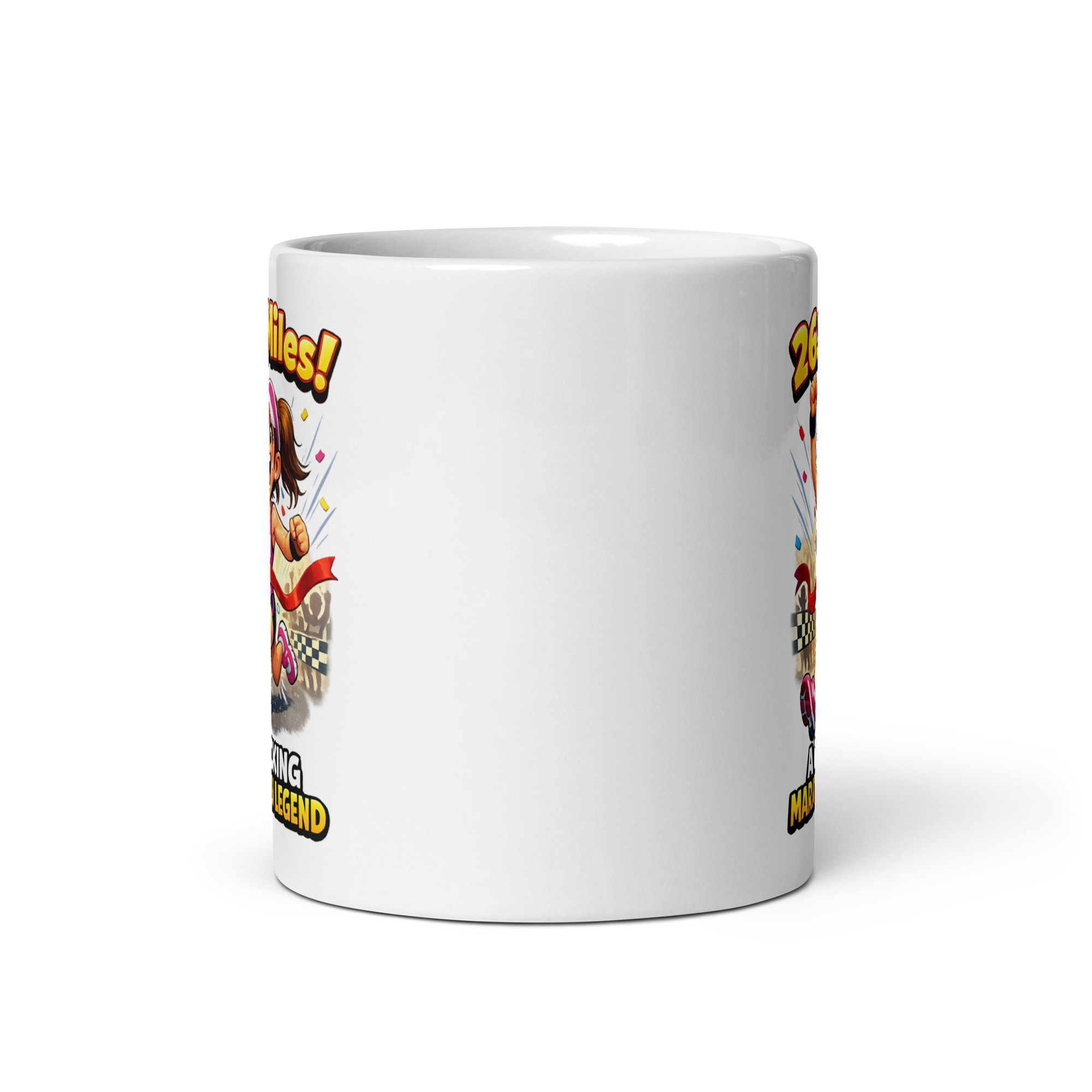 This is not a shy little novelty mug tucked away in the back of the cupboard. It is bright, cheeky and full of personality, with bold yellow text, strong black outlines, pops of pink and red, and a cartoon runner that gives the whole design a proper celebratory feel. It captures that brilliant post-race moment when the pain, sweat, blisters and dodgy pacing decisions suddenly become worth it because you have crossed the line and joined the 26.2 club.