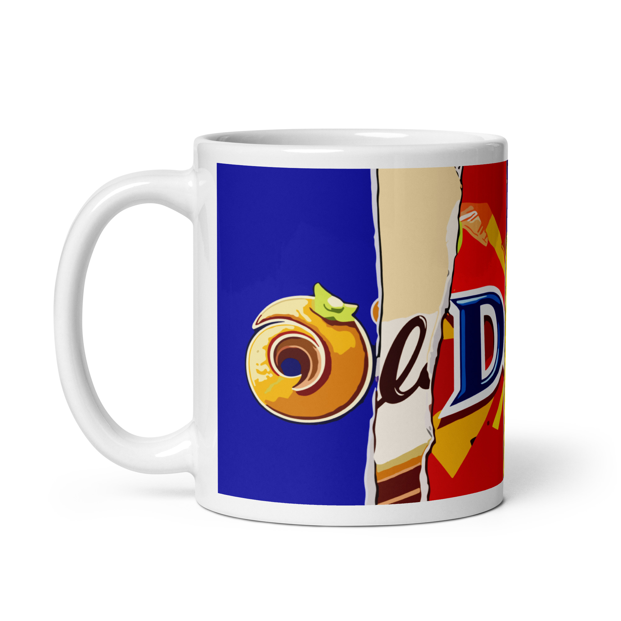It measures 3.8 inches high and 3.2 inches in diameter, so it has that classic, comfortable shape most people reach for every day. The white ceramic body gives the bright wrapper-style print loads of contrast, helping the colours stand out nicely and keeping the design looking crisp from every angle. Because the artwork wraps around the mug, it has a fuller, more all-over look than a standard front-print design, which makes it feel that bit more distinctive on a desk or kitchen side.