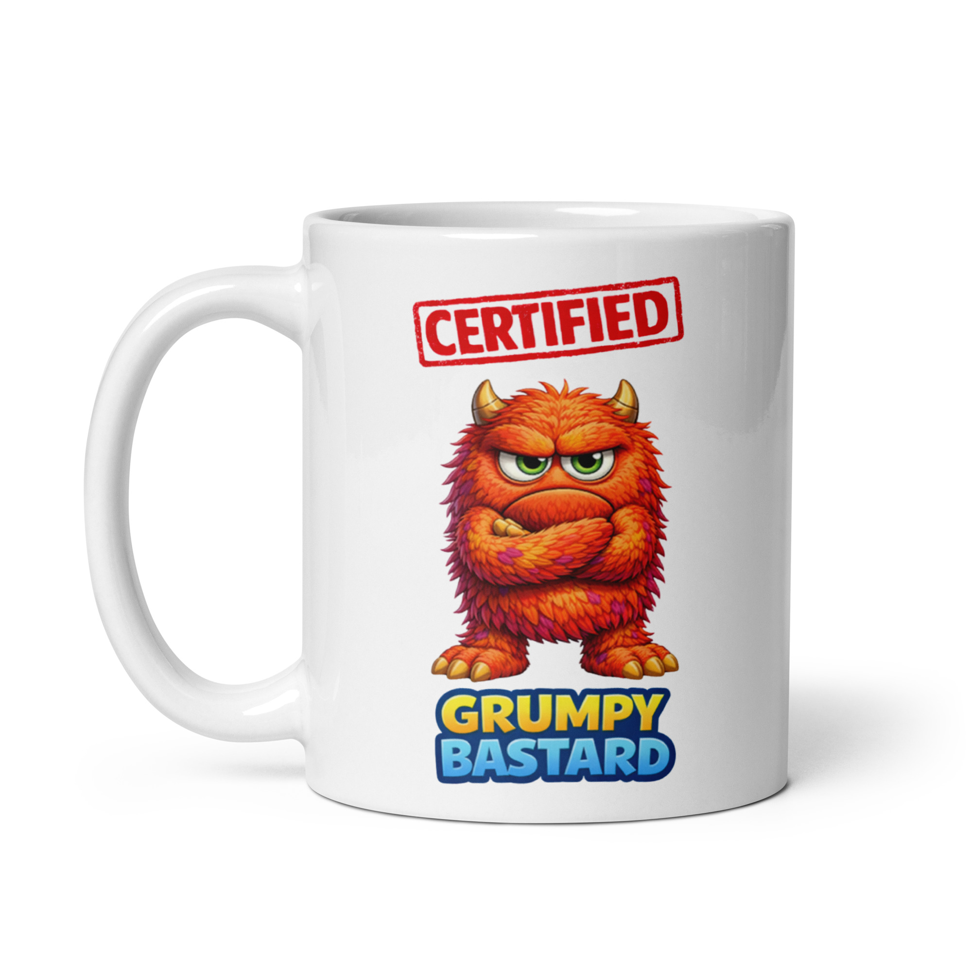The big red “CERTIFIED” stamp across the top is a lovely touch as well. It gives the whole mug that mock-official feel, like someone has finally stopped dancing around it and made the diagnosis public. Certified grumpy bastard. No more debate needed. The bold yellow and blue lettering at the bottom finishes it off nicely, keeping the design bright and eye-catching while making sure the rude phrase stands out straight away.