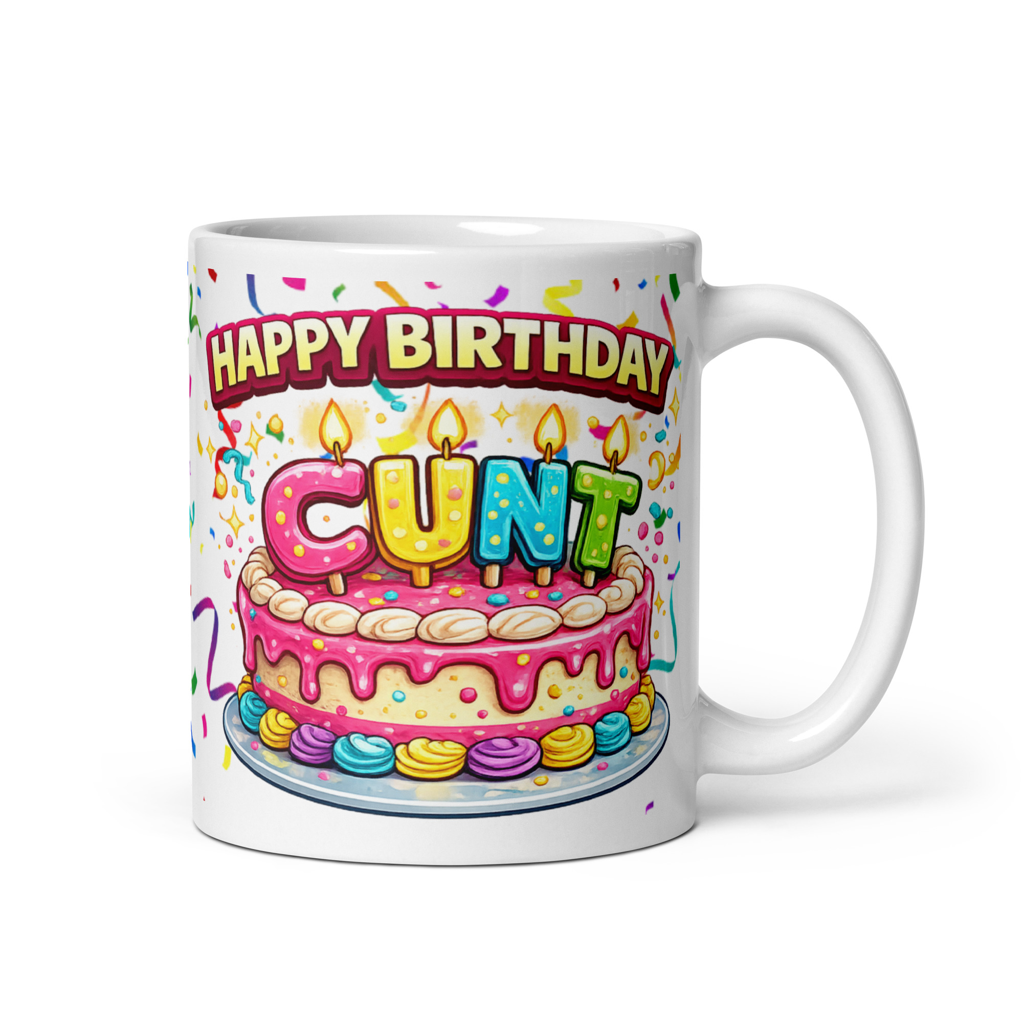 The design makes the whole thing even better. Front and centre is a bright pink birthday cake covered in dripping icing, colourful decorations and massive candle letters spelling out “CUNT” across the top. Above it, “Happy Birthday” arches proudly over the cake, while confetti and streamers explode around the background to give the whole mug a proper party feel. It is cheerful, ridiculous and just the right amount of wrong. That contrast between the cute birthday cake and the brutally blunt wording is what gives this mug so much charm. It feels festive, funny and absolutely made for people whose love language is aggressive banter.