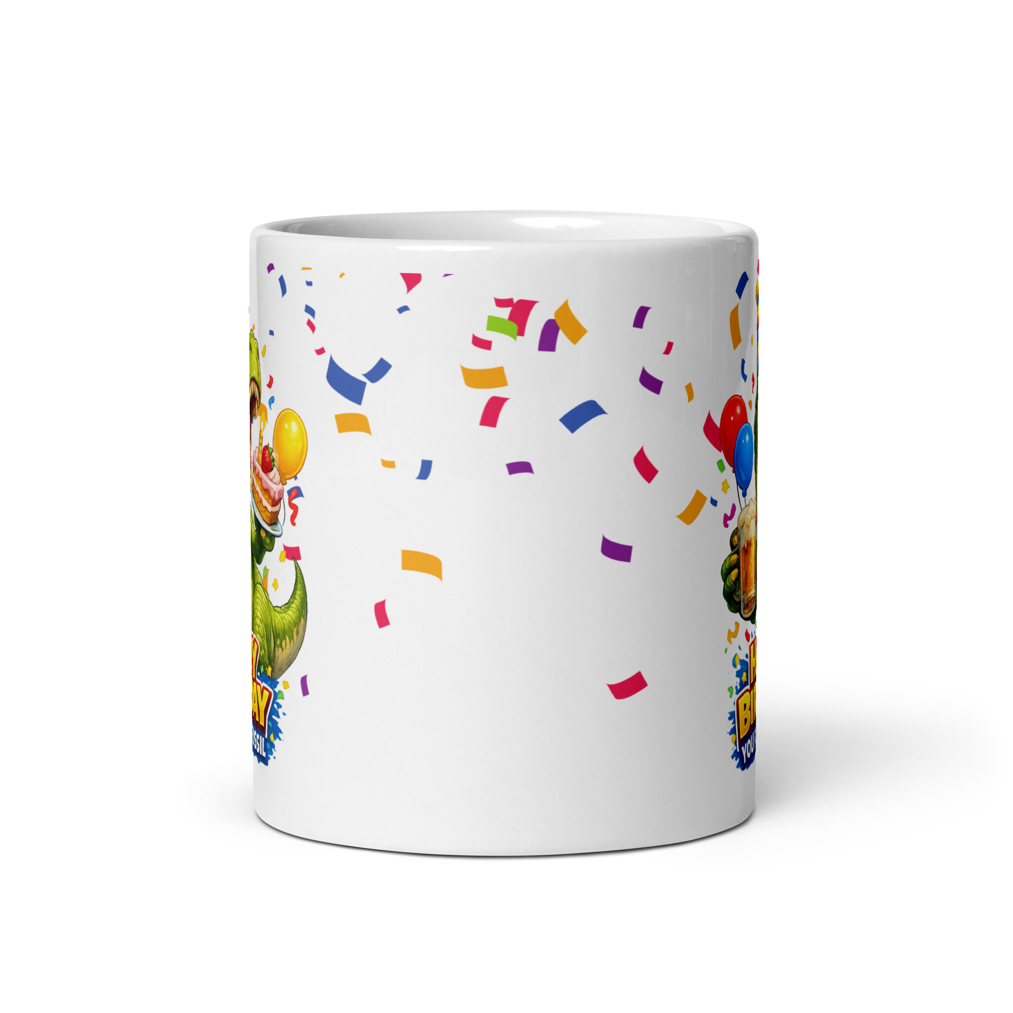 As funny as the slogan is, the design itself does a lot of the work. The dinosaur has real personality, with a wide open grin, bright green colouring and a slightly manic party energy that makes the whole mug feel lively. Add in the balloons, confetti, cake and frothy pint, and it looks like absolute birthday chaos in the best possible way. The large, colourful “Happy Birthday” text gives it instant occasion appeal, while the rude line underneath makes it very clear this is not one for the easily offended.