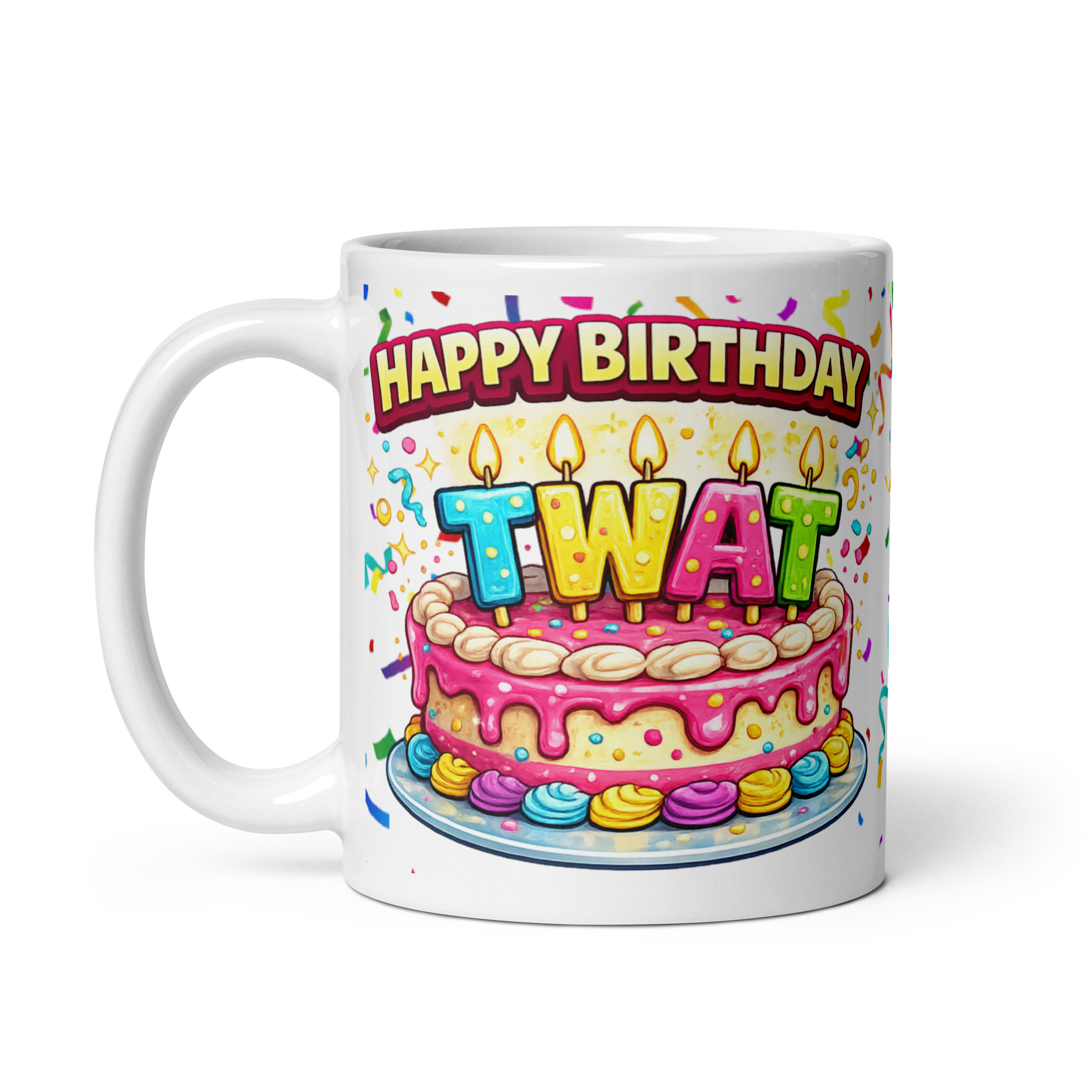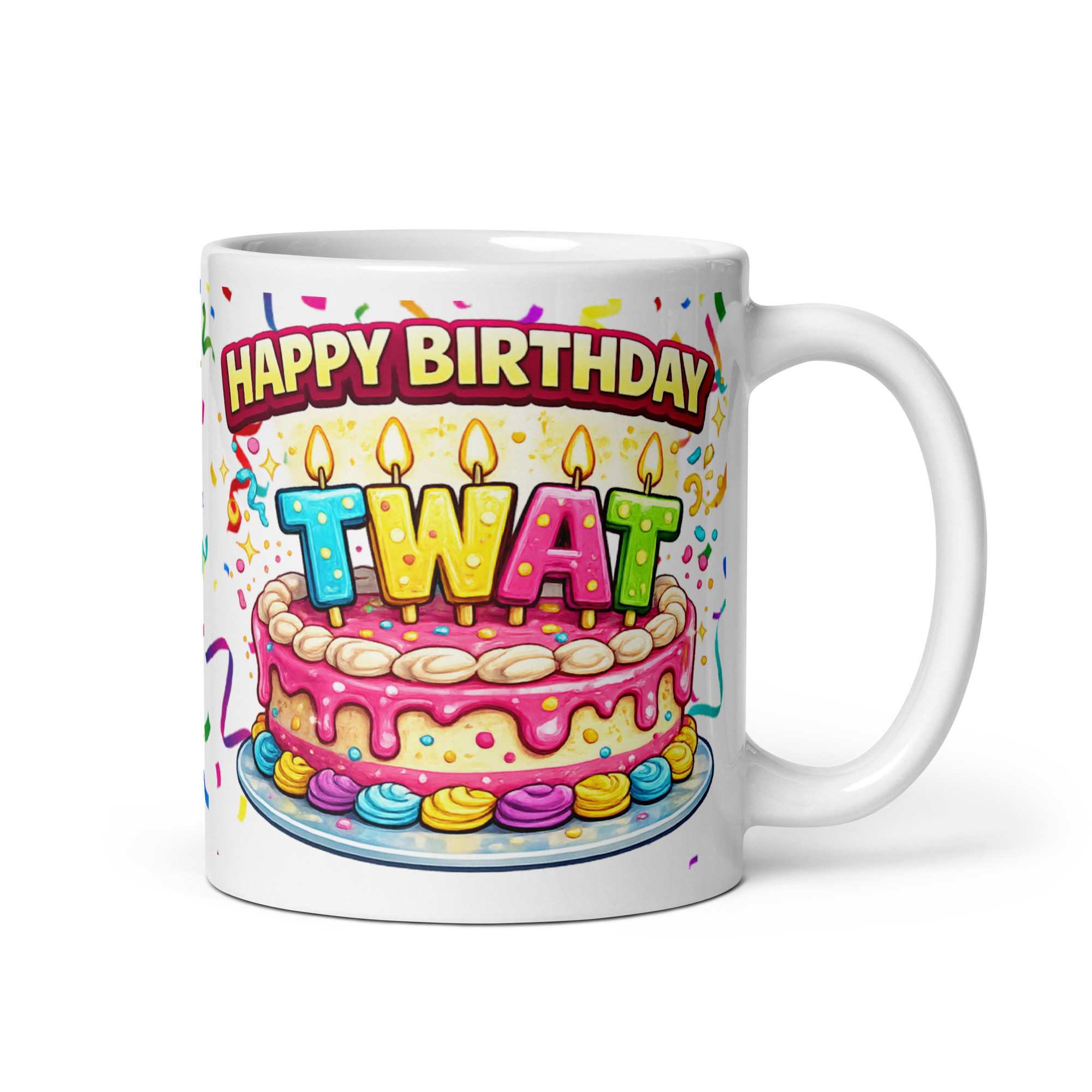 The design has loads of party energy too, which makes the rude message land even better. Front and centre is a big pink birthday cake dripping with icing, covered in sprinkles and topped with colourful candle letters spelling out “TWAT”. Above it, “Happy Birthday” arches over the top in bold lettering, while confetti and streamers fill the background to give the whole mug a proper celebration feel. It is playful, bright and full of personality, which helps it feel like a genuine birthday gift rather than just a throwaway rude joke. The contrast between the sweet cake design and the gloriously daft insult is exactly what makes it work so well.