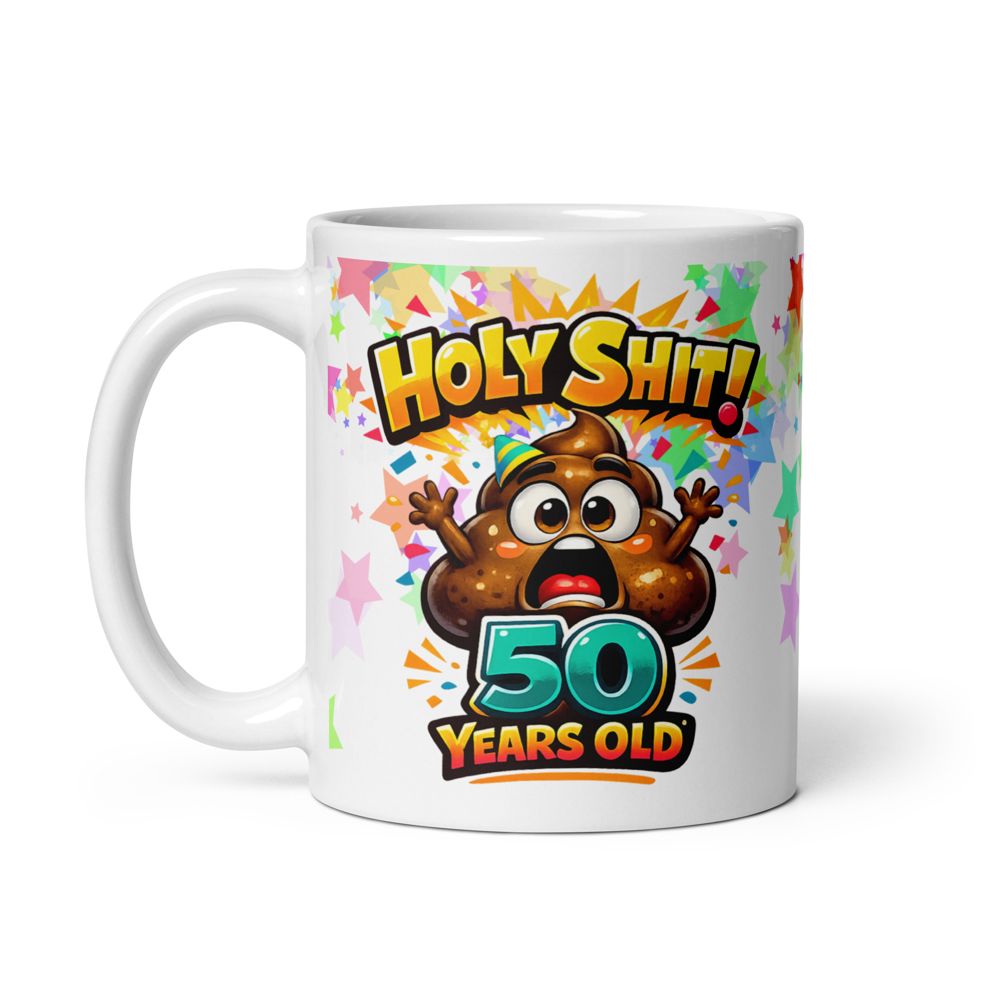 The design does not hold back either. Front and centre is a panicked cartoon poo character in a tiny party hat, arms in the air and eyes wide as if it has just heard the age and cannot believe what is happening. Above it, “Holy Shit!” explodes across the mug in big comic-style yellow and orange lettering, while the bold turquoise “50 Years Old” underneath makes the joke land with all the subtlety of a birthday hangover. Around the whole thing are colourful stars, confetti and party bursts, giving it a proper chaotic celebration feel. It is childish, ridiculous and exactly the sort of design that gets a laugh before they have even opened the card.