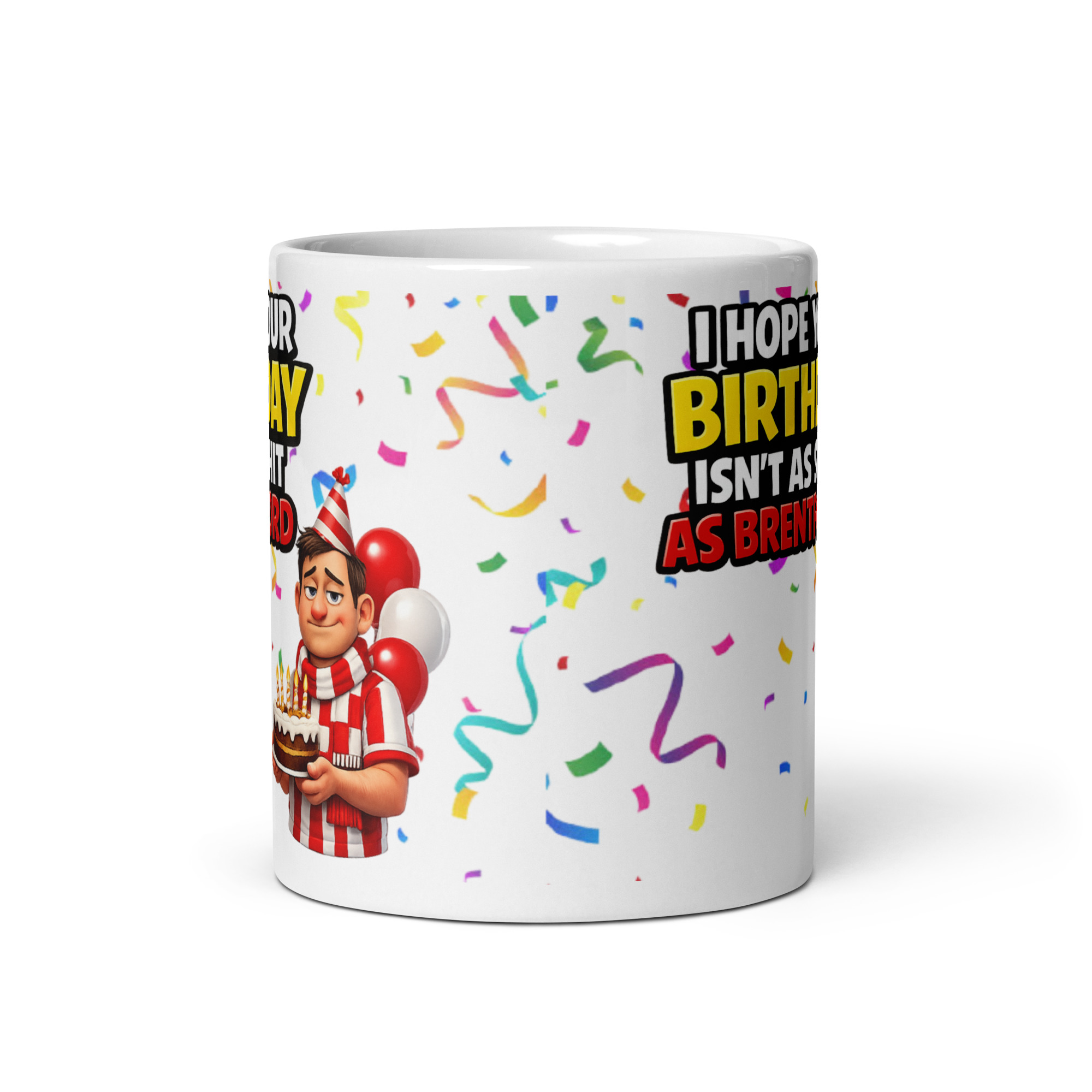 The artwork gives it loads more personality than a plain text mug too. The wording is big and bold, with “BIRTHDAY” in bright yellow and “AS BRENTFORD” in red, so the joke hits straight away without needing a second look. Around the text, there is colourful confetti flying across the design, which gives it that proper birthday-party feel instead of looking like just another football novelty mug. Then you have the fed-up cartoon supporter in red and white, party hat on, balloons behind him and birthday cake in hand, looking like he is trying his best to celebrate while life keeps letting him down. That sad little expression is what really sells the joke. It is silly, sharp and spot on for anyone who likes their football humour a bit petty.
