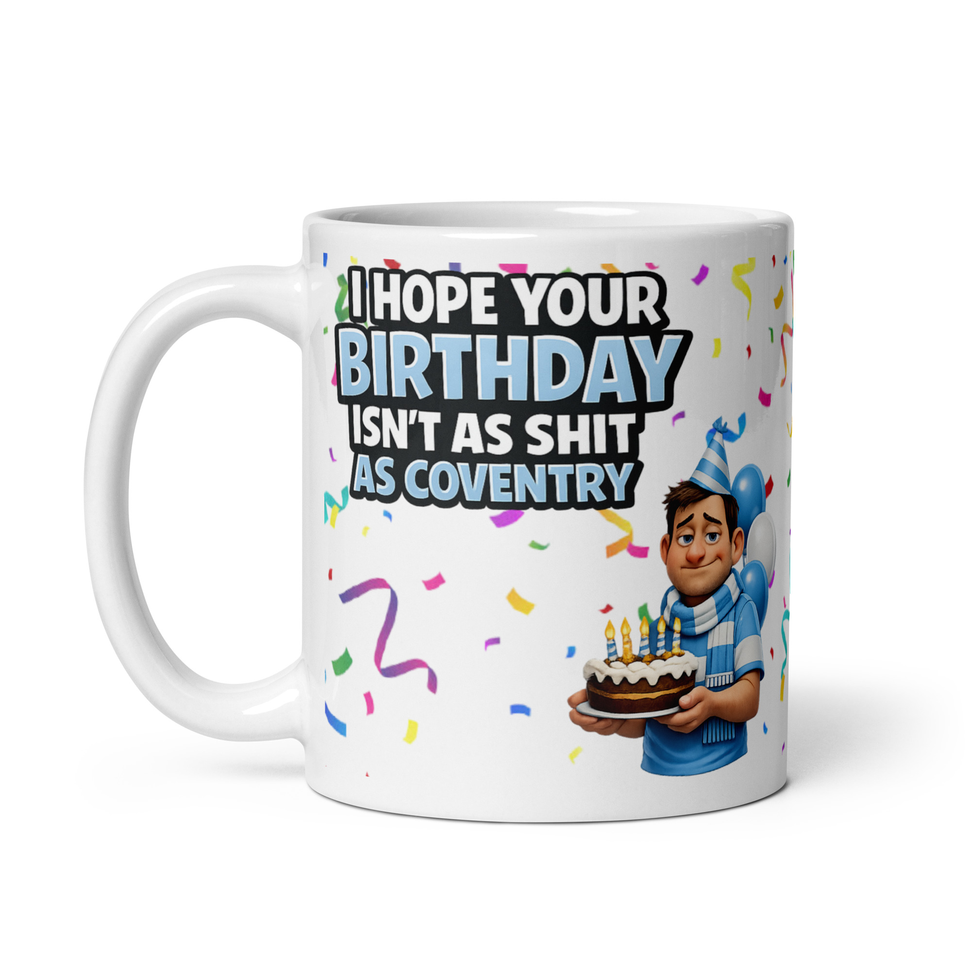The design makes the joke even better. The wording is huge and easy to read, with “BIRTHDAY” in pale blue and “AS COVENTRY” in matching club-inspired tones that instantly give the mug a football feel. The white ceramic background keeps everything looking crisp, while the bright confetti scattered around the print gives it a lively birthday-party look. Then there is the fed-up cartoon supporter on the side, dressed in sky blue with matching scarf, party hat, balloons and birthday cake, looking like he is doing his best to celebrate through the disappointment. That slightly miserable little face gives the whole thing loads more personality and makes it feel much more giftable than a plain slogan print.