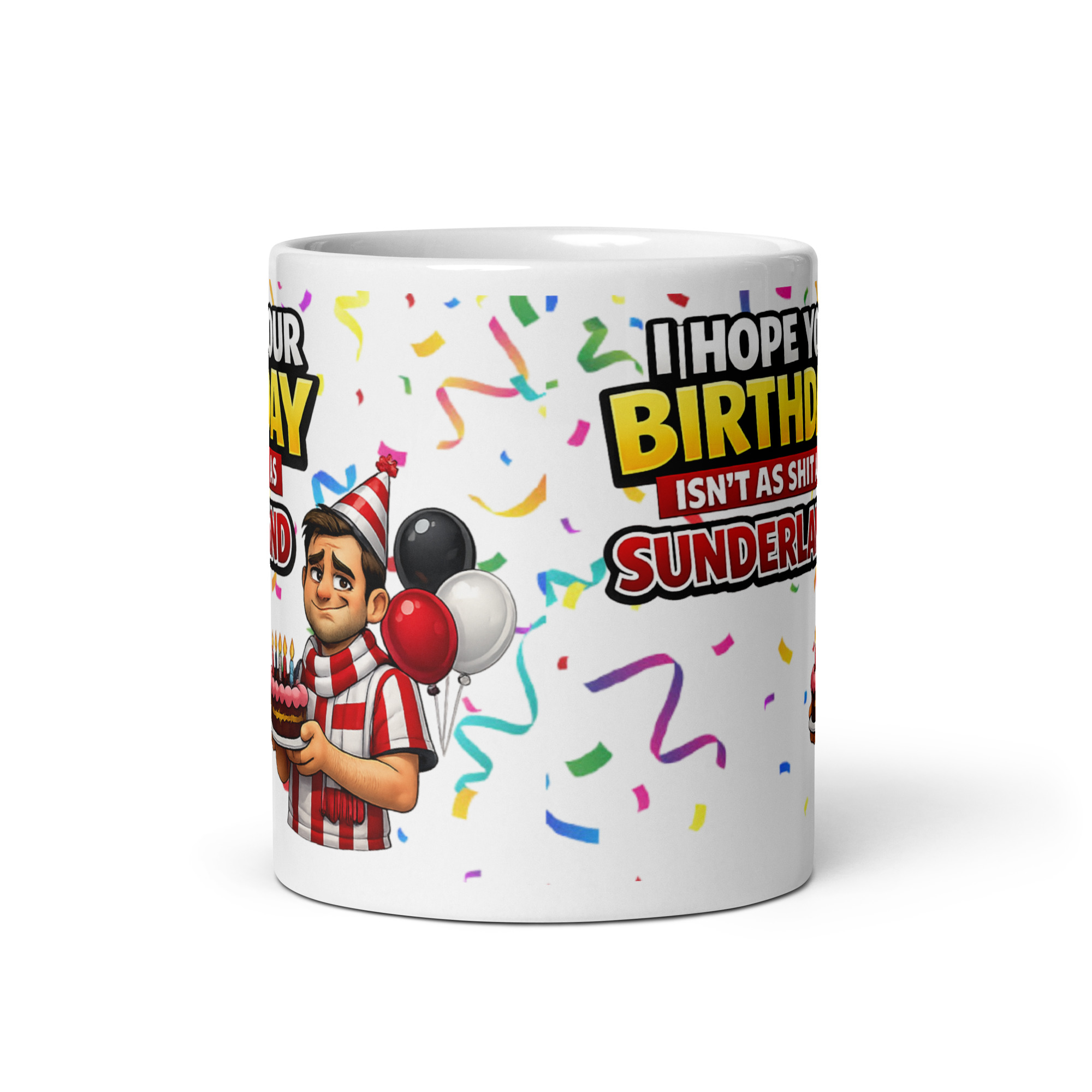 The artwork gives it loads of character as well. The main text is huge and impossible to miss, with “BIRTHDAY” in bright yellow and “SUNDERLAND” in a punchy red that stands out brilliantly on the white ceramic. Colourful confetti is scattered across the design, which gives it a lively birthday-party feel rather than making it look like just another generic football novelty mug. Then there is the fed-up cartoon supporter on the side, dressed in red and white with a party hat, balloons and a birthday cake, looking like he is trying very hard to enjoy himself despite the obvious disappointment. That slightly miserable expression is what really sells the gag. It is daft, eye-catching and full of the sort of football-themed personality that makes a gift feel properly chosen rather than grabbed in a panic.