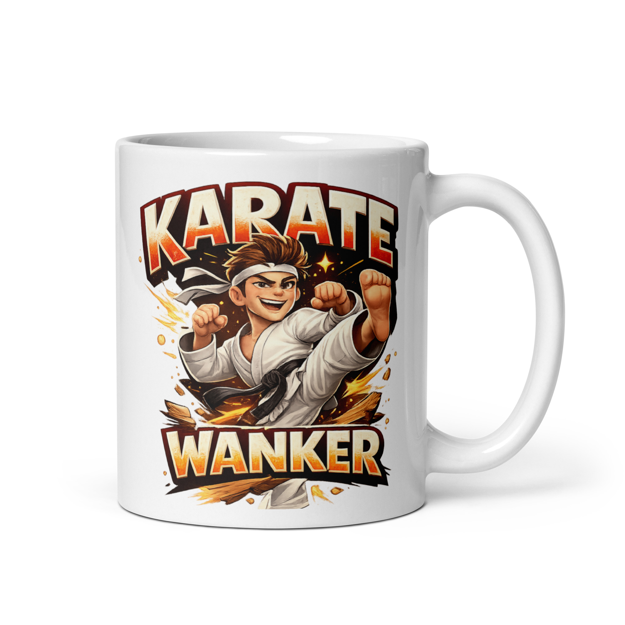 Karate wanker mug humour does exactly what you want from a proper rude novelty gift. It takes something that already sounds serious, disciplined and worthy of respect, then kicks the door off its hinges with a bit of filthy British banter. This design goes all in on that idea, featuring a smug cartoon karate lad mid-kick in a white gi and black belt, bursting through splintered wood with the words “KARATE WANKER” in huge bold lettering above and below him. It is loud, daft and brilliantly over the top, which makes it a cracking funny gift for karate fans who do not mind being ripped to pieces.