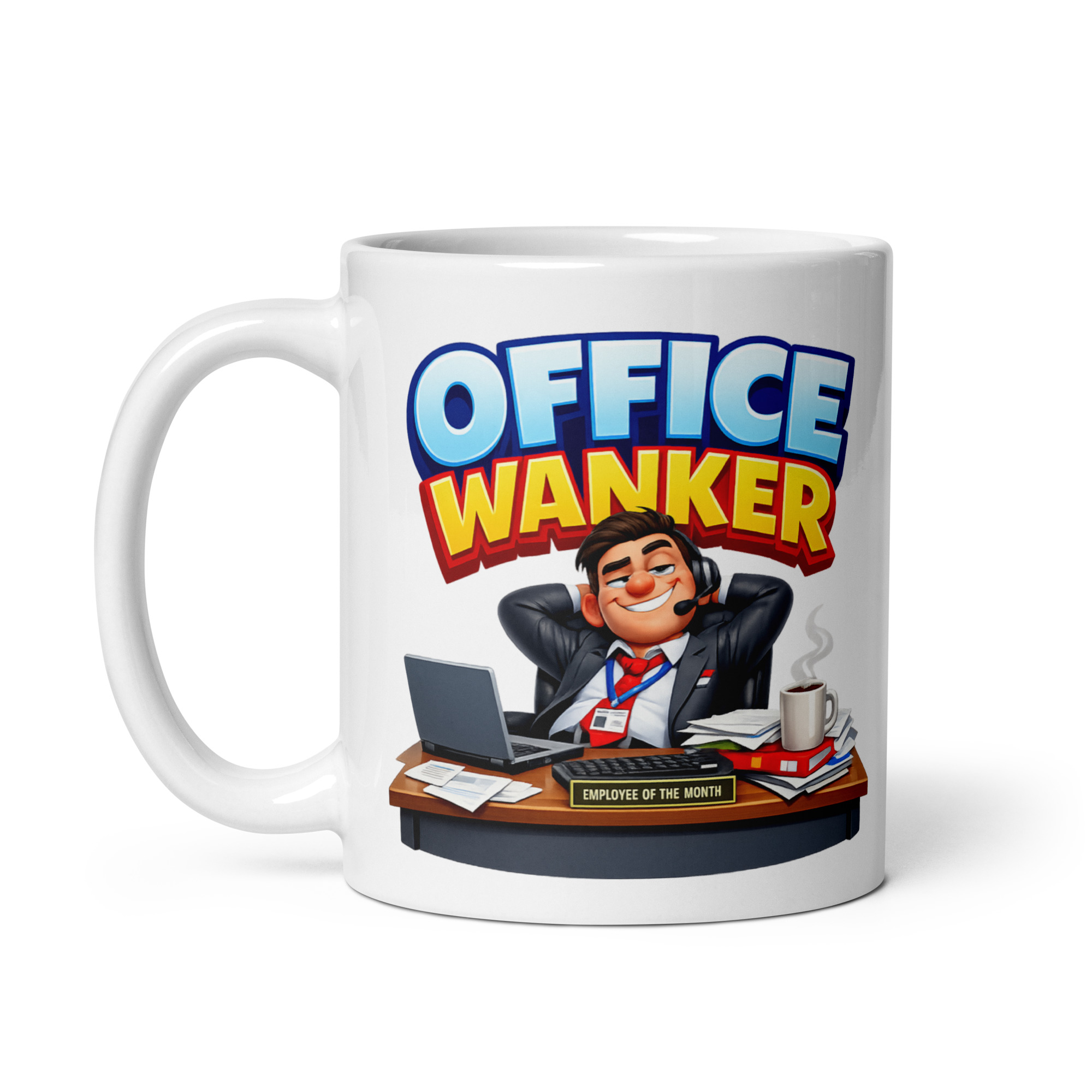 Office wanker mug is exactly the kind of rude little masterpiece that belongs in a workplace where banter is strong, patience is thin, and at least one person acts like they are running the whole place while barely answering emails. If you are after rude office mugs funny enough to get a proper reaction, this one absolutely delivers. Front and centre, the design shows a smug office hero kicked back in his chair with a headset on, tie loosened, laptop open, paperwork piled high and a steaming mug nearby, all sitting above an “Employee Of The Month” plaque that makes the whole thing even more ridiculous. Looming above him in huge colourful letters is the title he has so clearly earned: “Office Wanker”.