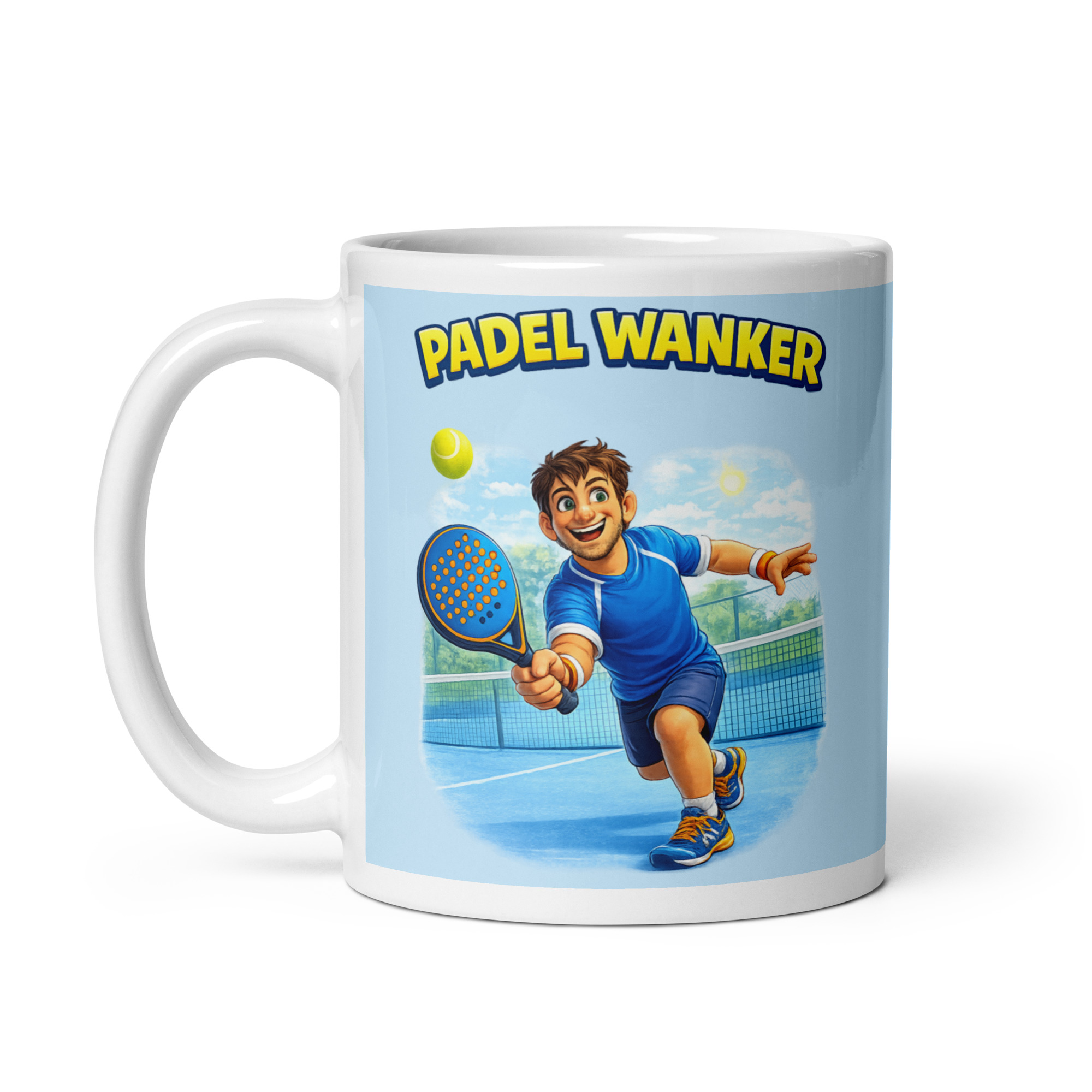 The colours work nicely too. The blue sports kit ties in with the sky and court, while the yellow ball and bold yellow lettering help the design pop. The thick blue outline around the text keeps it clear and punchy, so the phrase “PADEL WANKER” stands out straight away without looking messy. It is a bright, modern design that feels sporty and fun, rather than cheap or overdone.