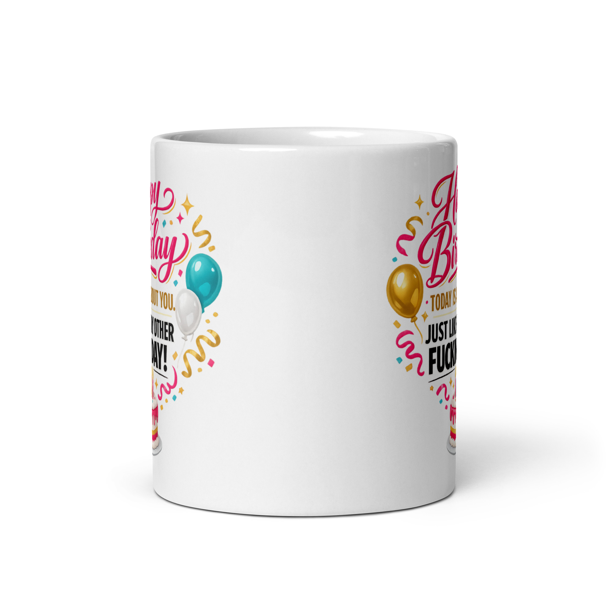 Rude happy birthday mugs do not get much more brutally accurate than this one. At first glance, it looks bright, cheerful and full of birthday charm, with bold pink script, colourful balloons, curling streamers and a frosted cake topped with candles. Then your eyes land on the punchline: “Today Is All About You. Just Like Every Other Fucking Day!” That is where this mug earns its place. It is sharp, funny and ideal for anyone whose birthday absolutely has to revolve around them, because let’s be honest, it usually does anyway.