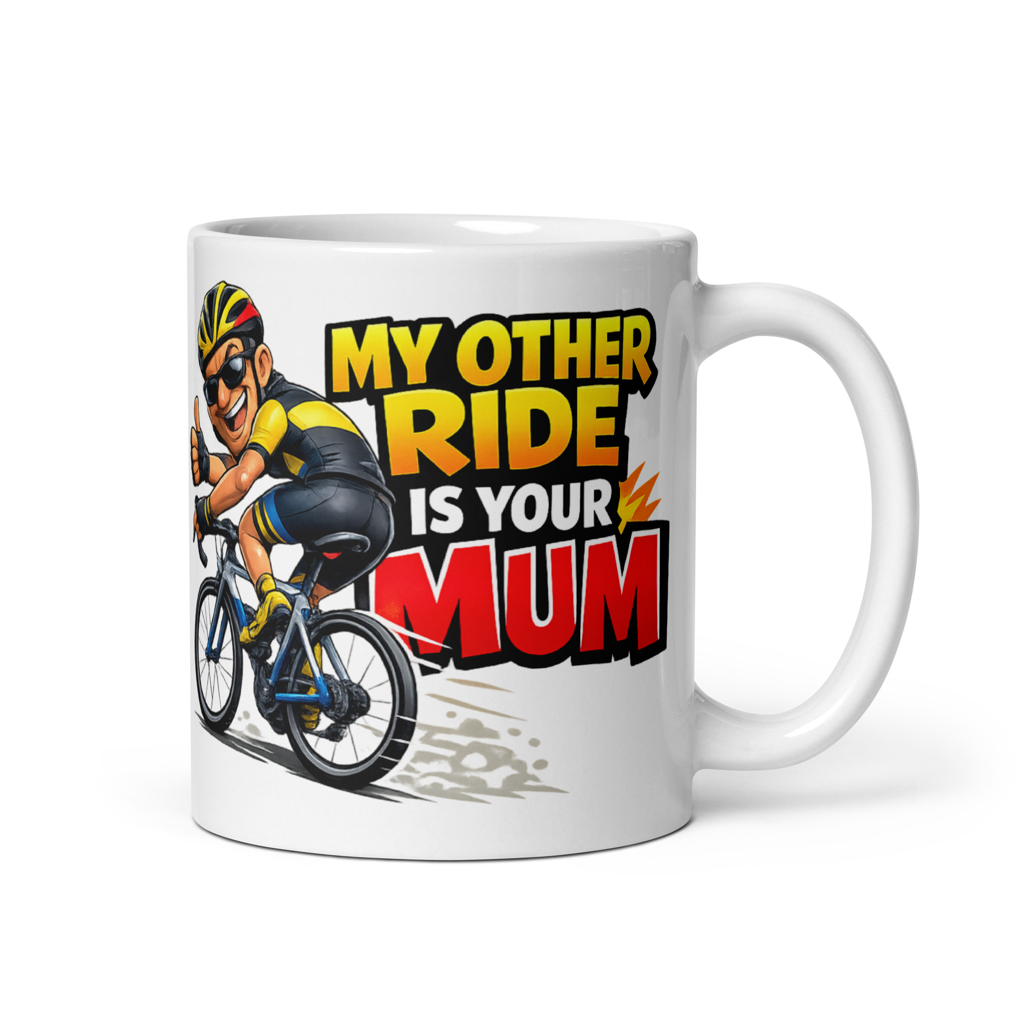 Rude mug for cyclists fans who like their humour fast, shameless and a bit out of order will get exactly what they came for with this one. The design is loud, cocky and impossible to miss, with a grinning cyclist in full gear tearing along on his bike while the slogan does all the damage: “My Other Ride Is Your Mum.” It is daft, cheeky and very much aimed at the sort of rider who enjoys a bit of banter almost as much as the ride itself.