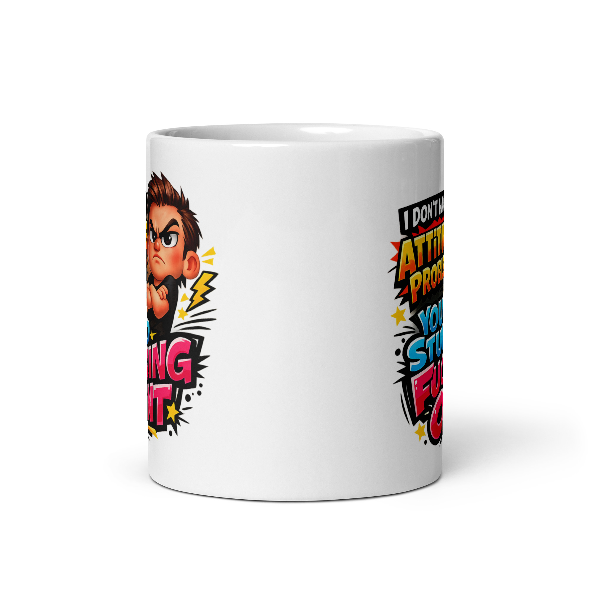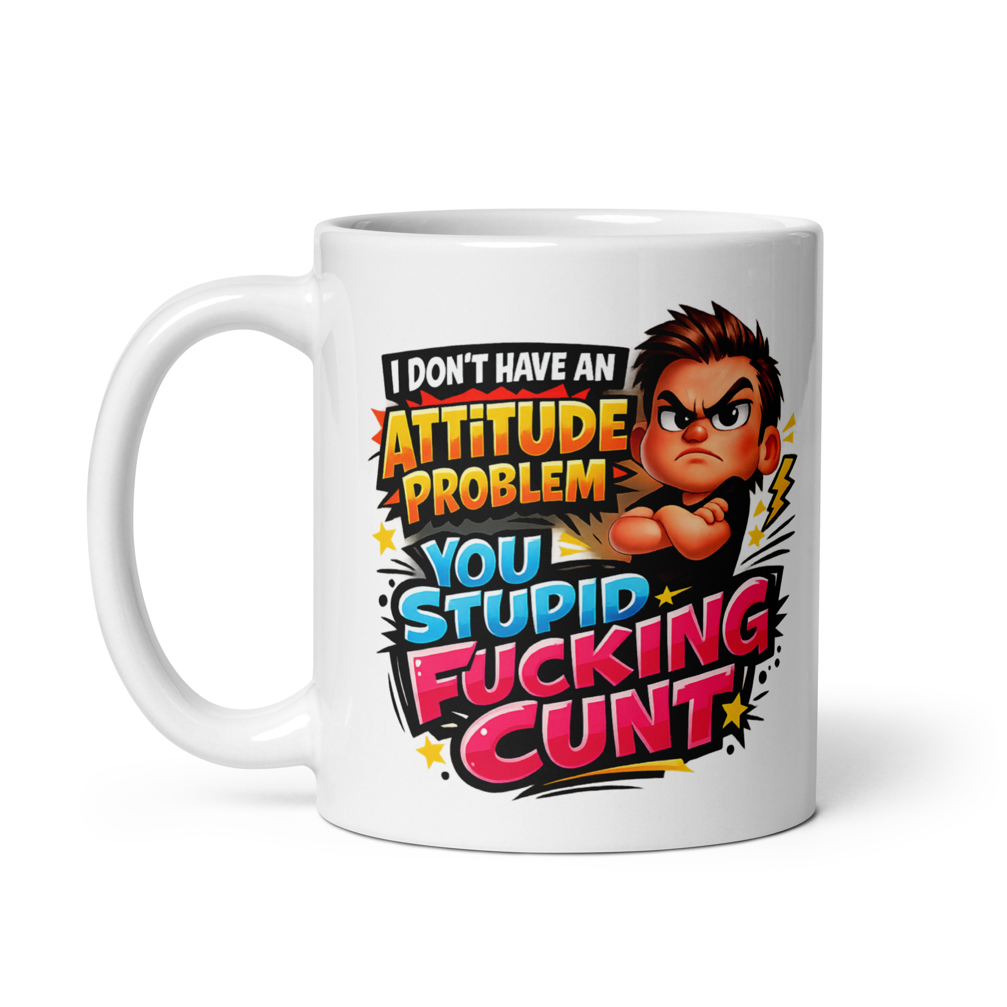 The design has a proper in-your-face energy from the first glance. The wording is stacked in huge comic-style text with bright blasts of yellow, blue, pink, and white that leap off the white ceramic. The phrase itself is the whole point, but the artwork gives it even more punch. Alongside the text is an angry cartoon character with folded arms, a scowl, and the exact expression of someone who is thoroughly done with everybody. The stars, bold outlines, and spiky graphic details make it feel loud and cheeky rather than flat, which is exactly what you want from a mug like this. It has got attitude dripping off it, even while claiming it has not got one.