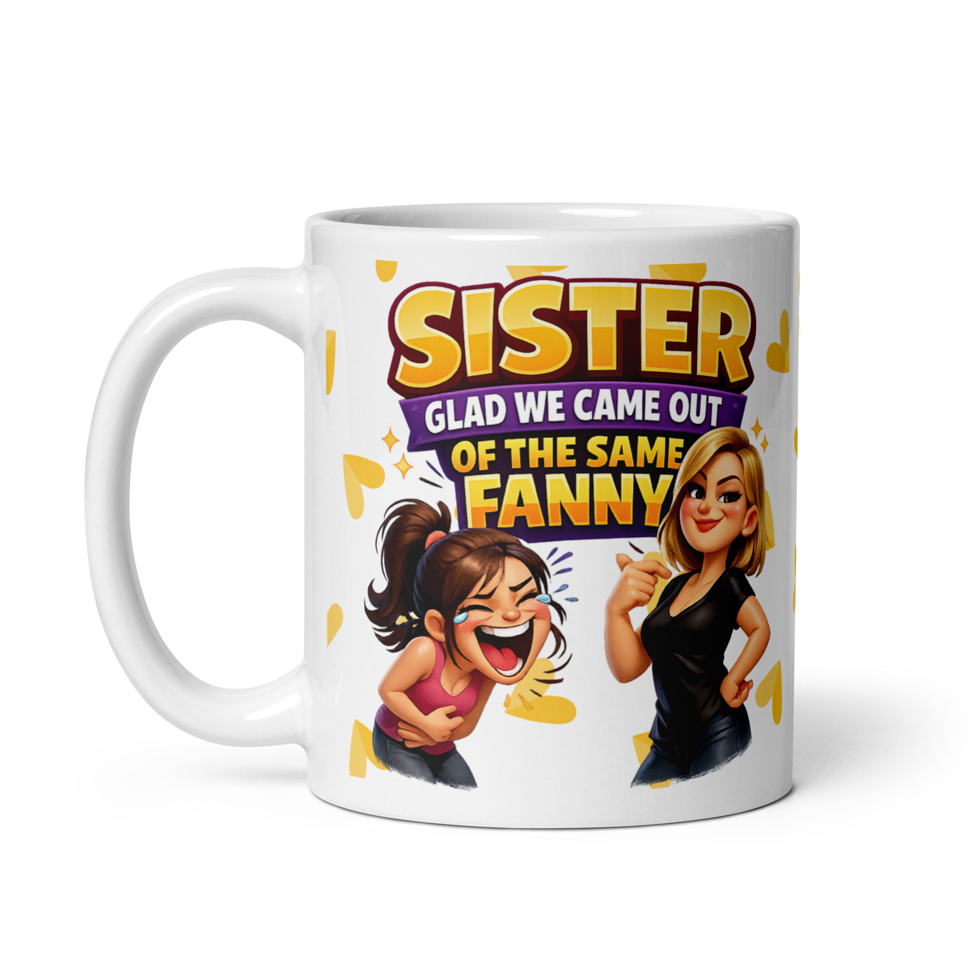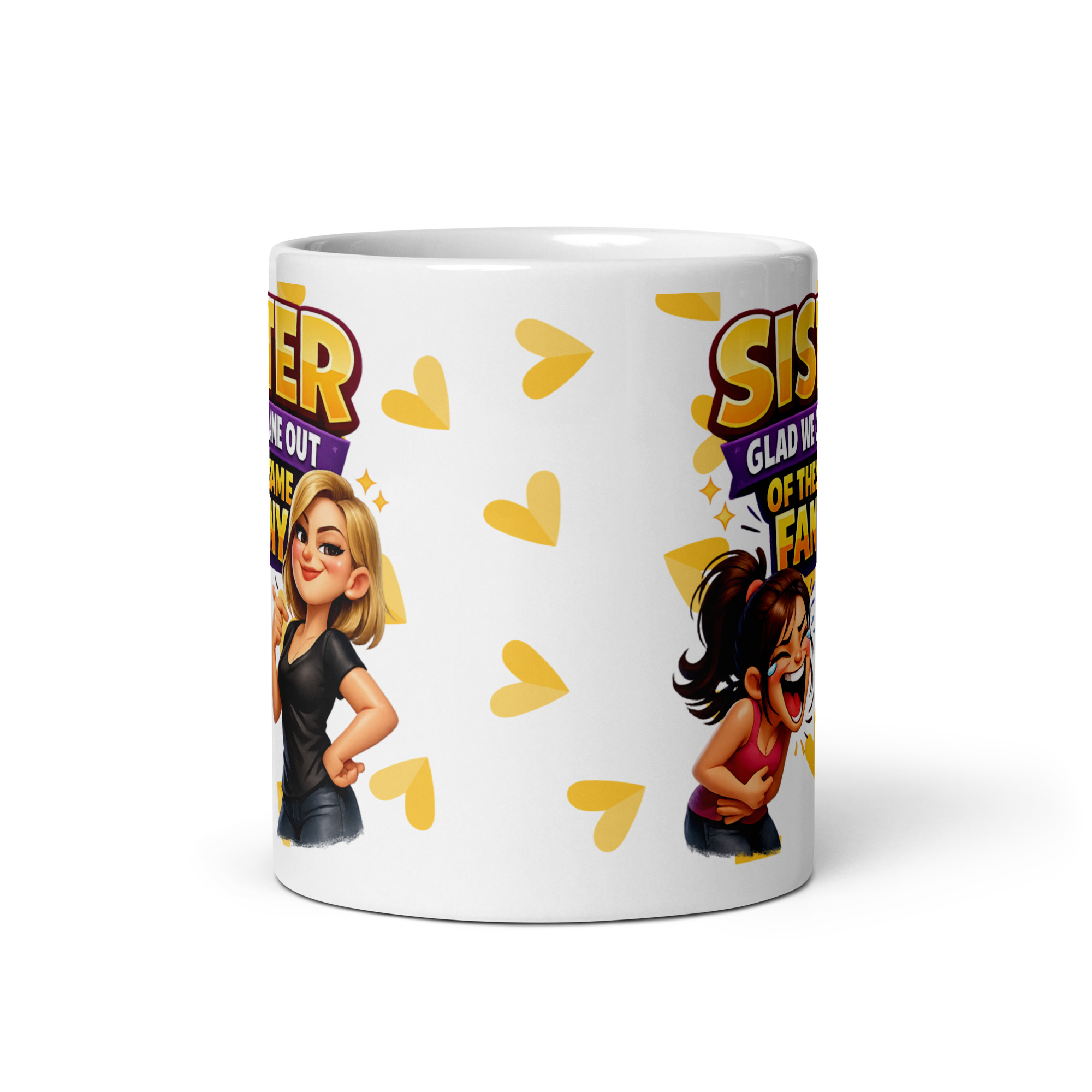 The design has loads of personality too. The text is bold and bright, with rich yellow and purple tones that stand out beautifully against the white ceramic, while the two cartoon sisters underneath bring the whole joke to life. One looks like she is absolutely howling with laughter, the other has that smug, self-satisfied expression that says she knows she is the better-looking sibling and is not above reminding everyone. Add in the scattered heart shapes and the whole thing lands somewhere between affectionate and completely inappropriate, which is pretty much the sweet spot for a proper rude sister gift.