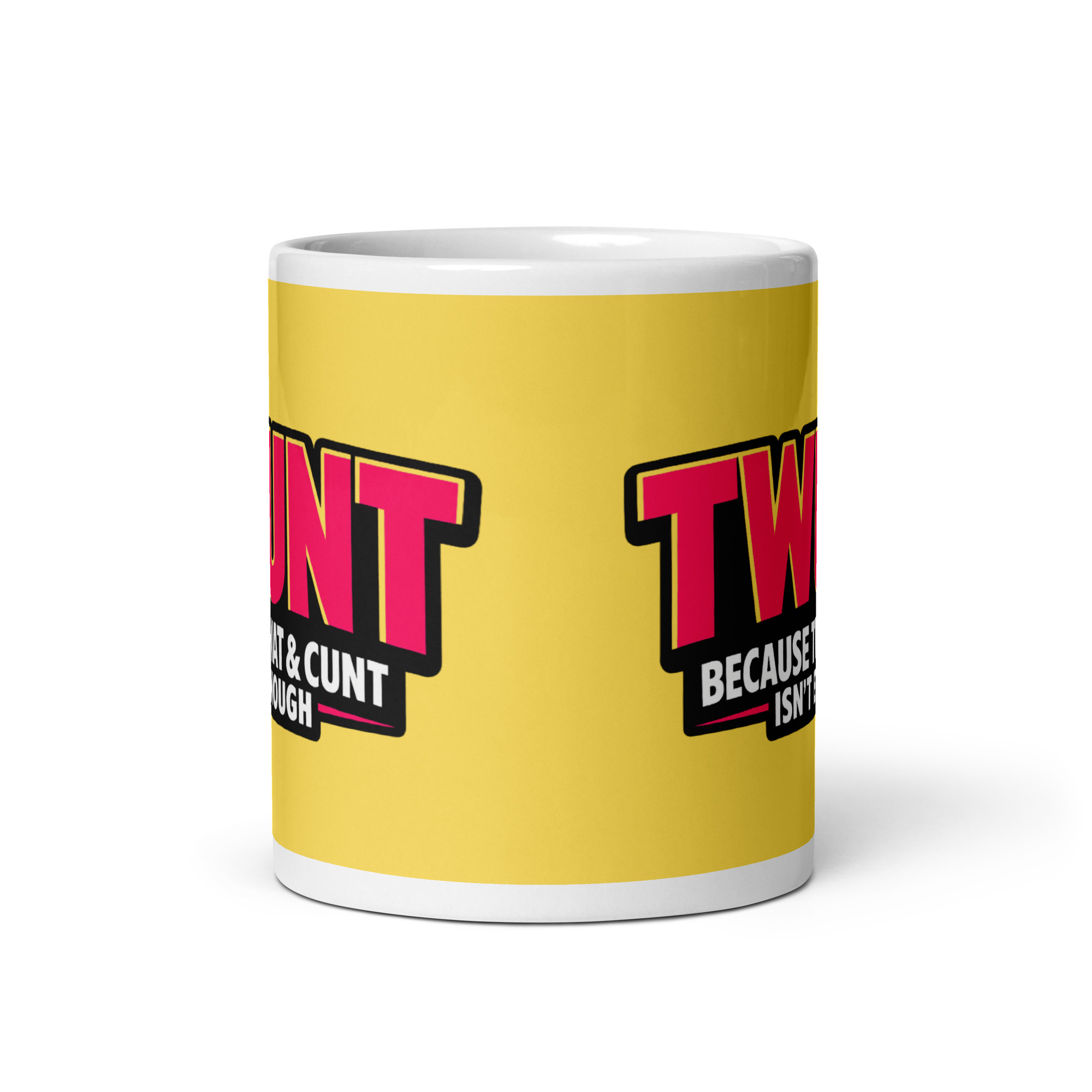 What makes this TWUNT mug so effective is how clean and confident the design is. It does not clutter things up with loads of graphics or overcomplicate the joke. The humour is all in the wording and the presentation, and both are spot on. The massive pink lettering against the rich yellow background gives it a bright, almost retro signboard feel, while the black backing panel behind the smaller text adds contrast and keeps the punchline easy to read. It is bold, graphic and instantly giftable.