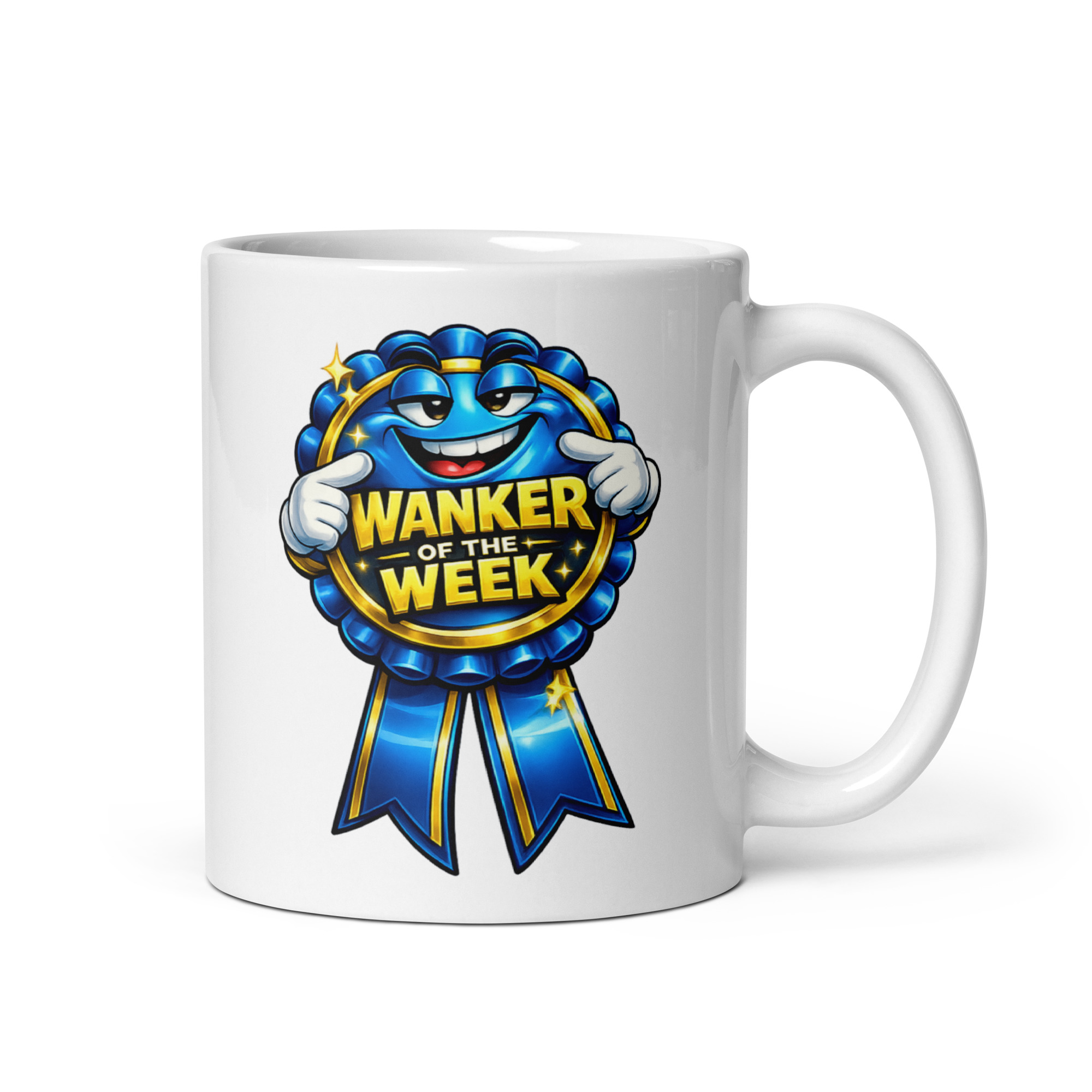 Wanker of the week award mug is a proper little beauty for anyone who has gone above and beyond in the art of being an absolute prat. Loud, rude and gloriously unnecessary, this design takes the idea of a congratulatory prize and gives it the exact level of disrespect it deserves. Front and centre is a bold blue award rosette with a smug face, cartoon hands and a grin that says it already knows who has won. Across the middle, in big gold lettering, it proudly announces “Wanker Of The Week”, turning everyday annoyance into a mock honour worth showing off.